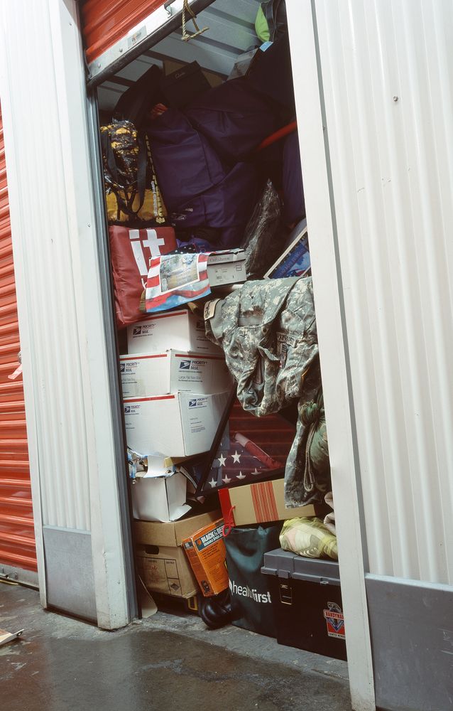 There is an image at the beginning of Inbal Abergil’s recent book, Next of Kin, that nailed me to my seat as soon as I flipped to the page. In the photograph, boxes, backpacks, and plastic containers are stacked high in an industrial storage locker. There’s an army combat uniform and a carefully folded American flag tucked into the heap; cardboard boxes buckle under the weight of heavier objects above.