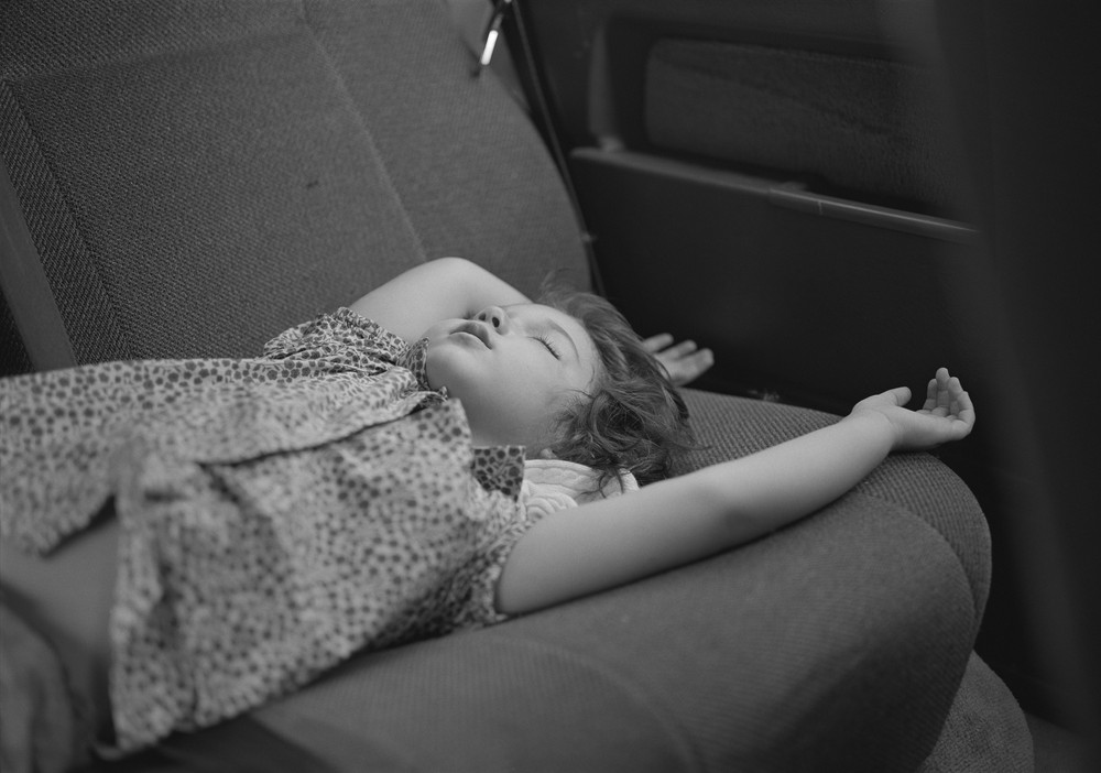 The most recurring presence in Insieme, though, is little Amelia who wanders through her parents’ images, sometimes appearing in color, sometimes in black and white, like the protagonist of this adventure. “Her hand or shoulder or back of her head are in so many of my frames, she’s always on the edge of my gaze. I resist photographing her directly,” Rozovsky says. “For Mark, she is often the subject and muse. It was intense and wonderful.” One picture towards the end of the book shows her outstretched in the back of a car, eyes closed in reverie, perhaps resting after a day out exploring.
