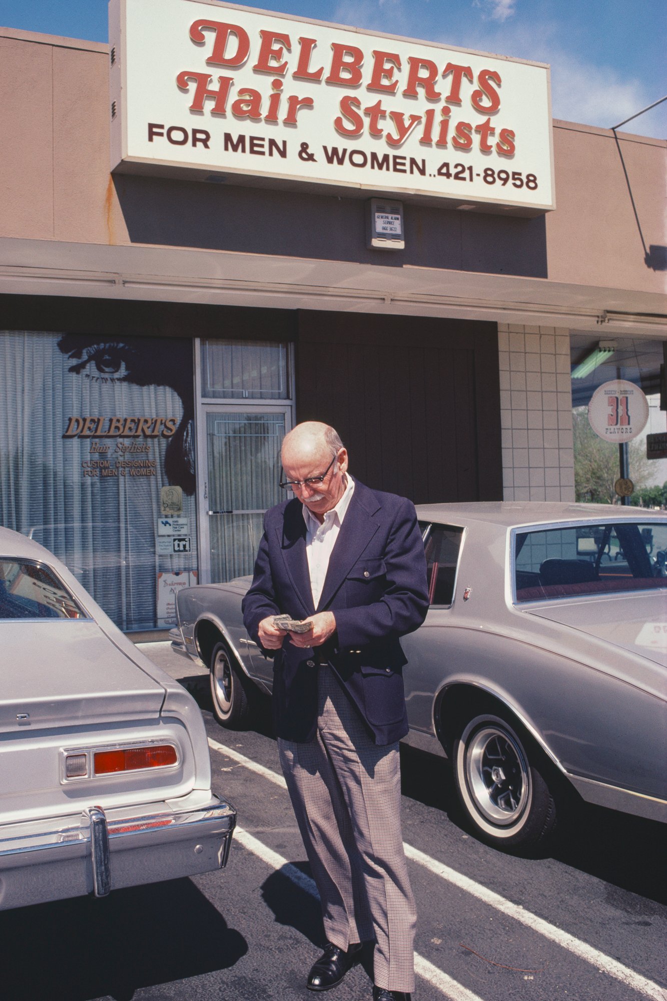 Bay Area-based artist Janet Delaney describes photography as “a currency of love” when describing her decades-old work, Too Many Products Too Much Pressure, recently published by Deadbeat Club. Photographed in 1980, the project documents her soon-to-retire father as he makes his rounds as a beauty industry salesman. We see salon owners, fellow salesmen, customers, and Delaney’s father, Bill, the star of the show. What began as a feminist undertaking to interrogate an industry that contributes to unrealistic beauty standards ended up providing the artist with a new understanding of her father—his sacrifices, his anxiety, his personality—and ultimately his love for his family.
