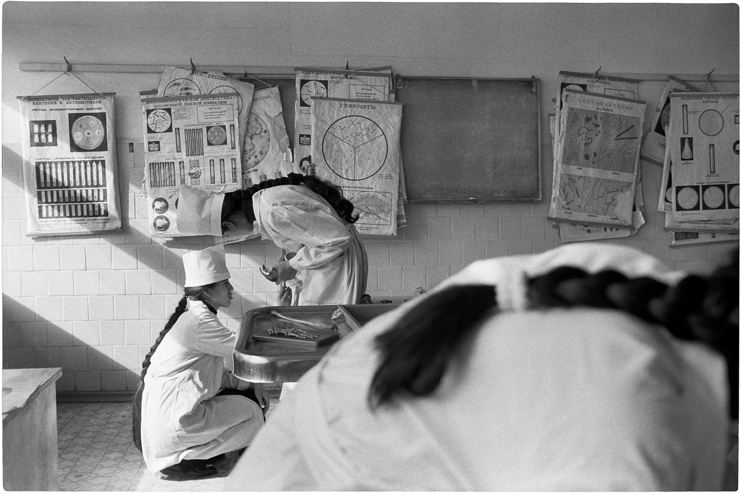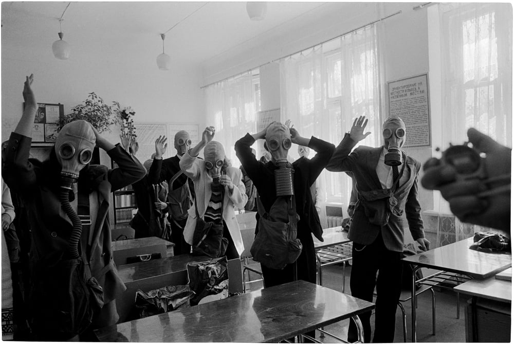 In the second chapter, the mood changes as Eskenazi pulls back the veil of communist USSR and begins to reveal another reality: a young girl stands beside the severed head of cow lying in a cart; a man wearing a Beatles shirt stands in front of four bodies dead on the ground; blood stains sheets on a surgeon’s operating room; a classroom of students wearing gas masks stand to participate in a drill.