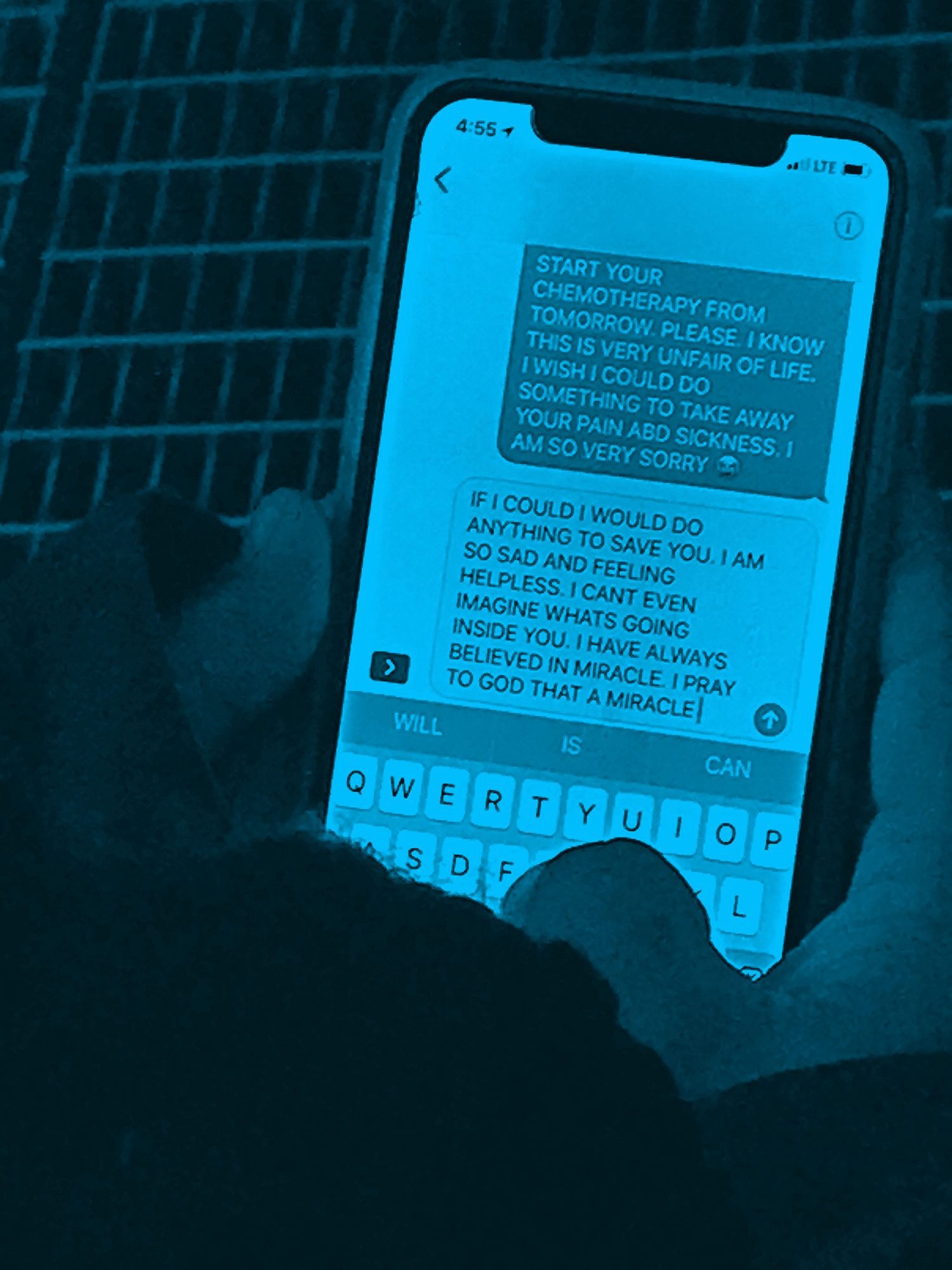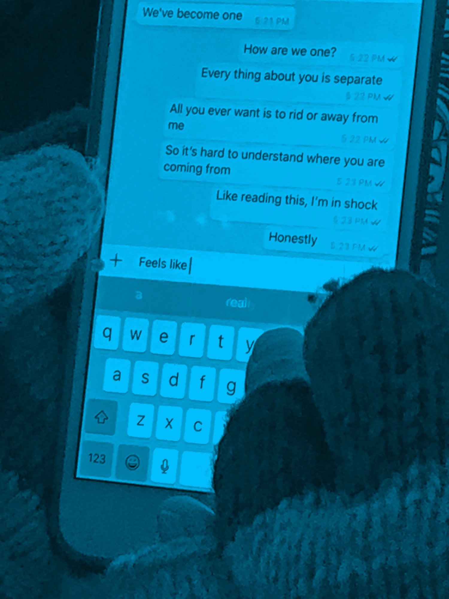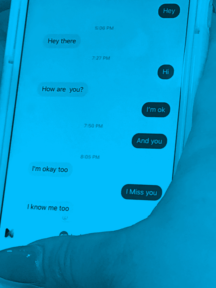 Washed in blue, in allusion to the light of the phone, the messages are sufficiently transformed as pictures, pulled away from the merely descriptive. Capturing and pausing the flurry of texts, opens up spaces for reflection, seeing in the most throwaway of exchanges a certain poetic and aesthetic value. The briefest of text exchanges becomes a contemporary love poem: “Hey, Hey there, Hi, How are you?, I’m ok, And you, I’m okay too, I Miss you, I know me too.”