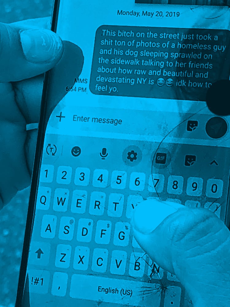 One message makes a critical point about documentary photography. The texter is appalled that “This bitch on the street just took a shit ton of photos of a homeless guy and his dog sleeping sprawled on the sidewalk talking to her friends about how raw and beautiful and devastating NY is.” Nowadays, people are, as this text reveals, much more aware of what it means to take another’s photograph. The text is of course laden with irony, written and sent oblivious to Mermelstein’s eavesdropping.