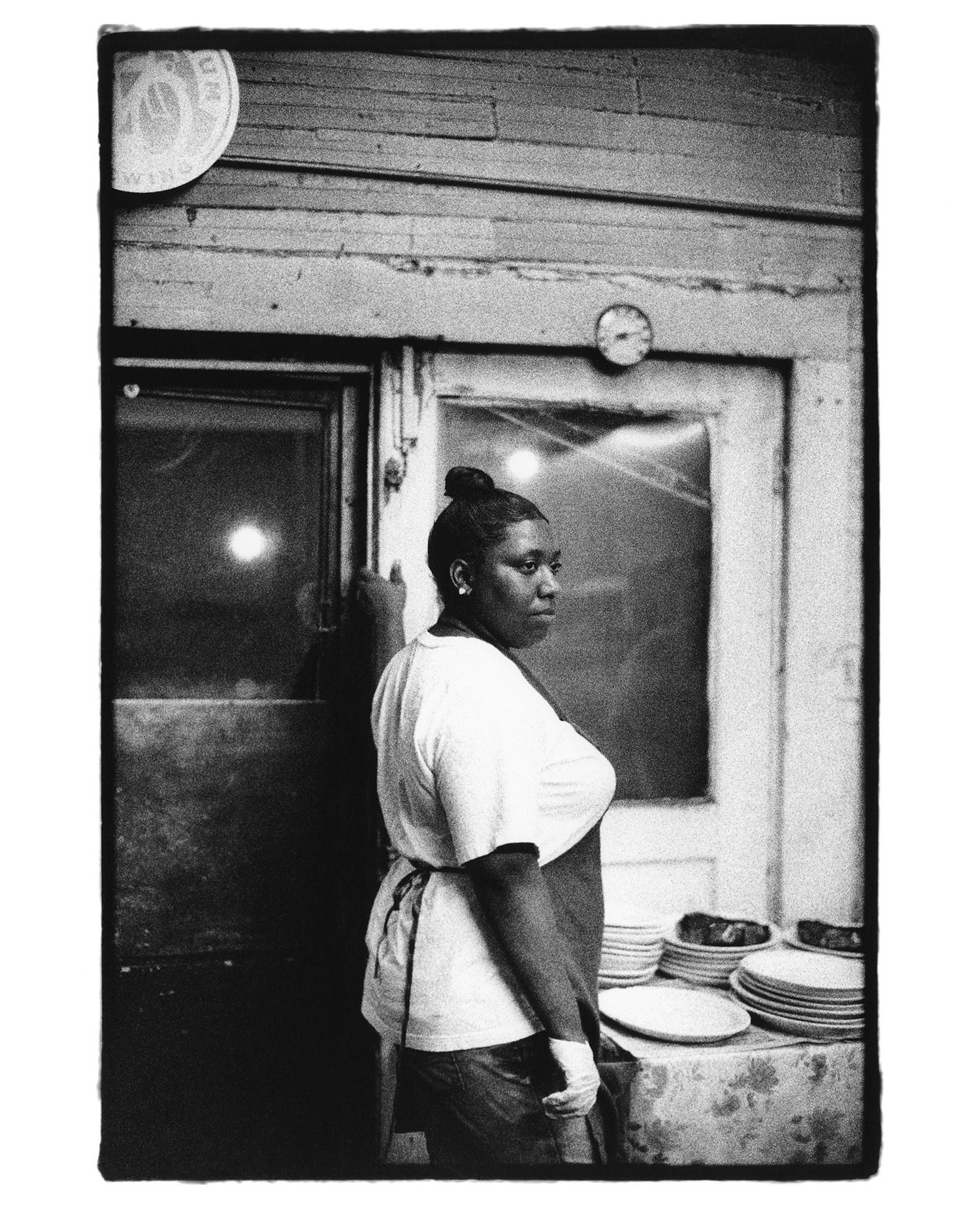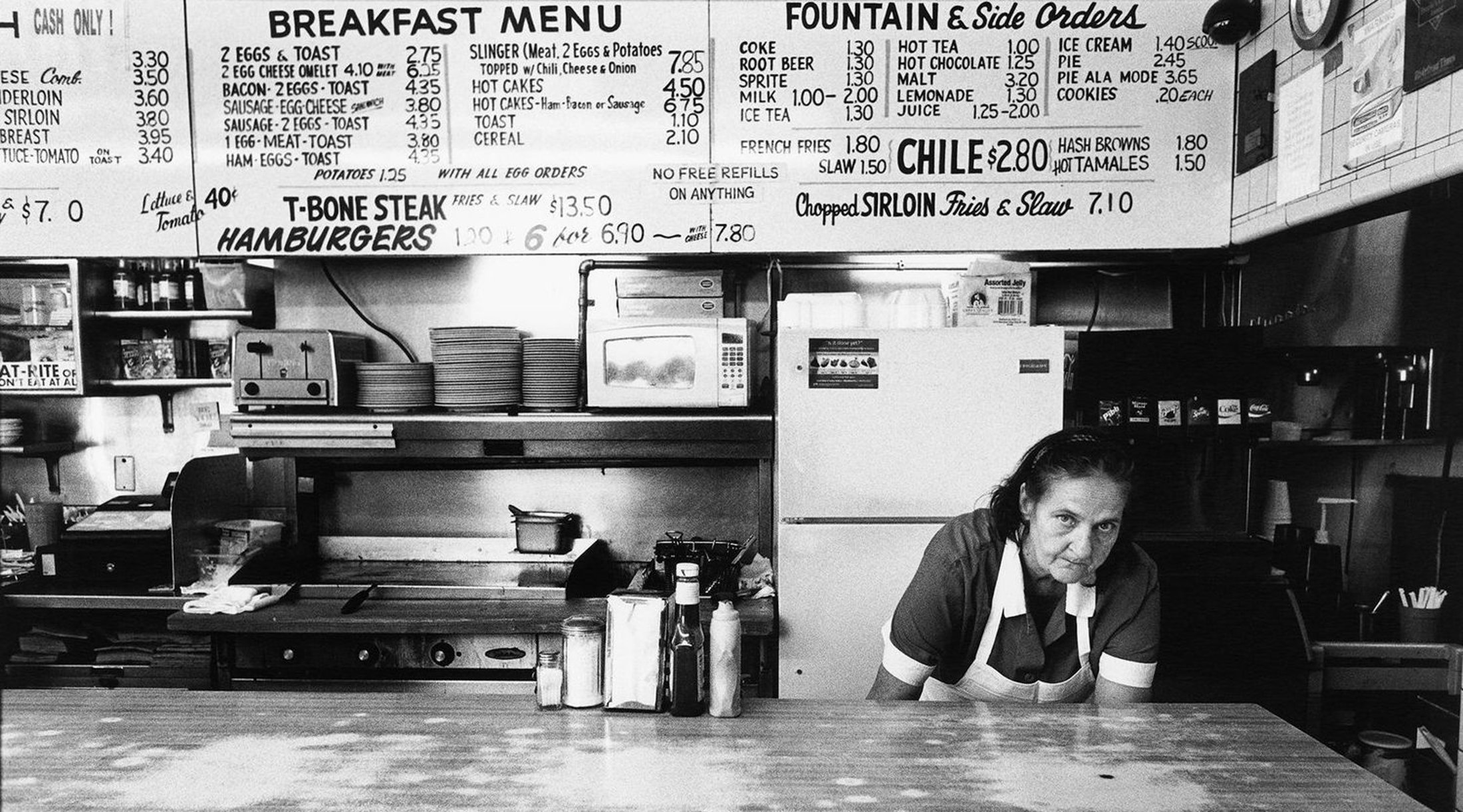 Historic. Loving. Familial. Honest. The book is elegant in its design. Every photograph is on the right hand page. Verso is blank, except for a very small page number. Open the book at the beginning, or anywhere, and the image is all you get. The image is everything you get. It’s large on the page. There is no text with the images, no captions or dates or apologies or claims. Just an old woman looking in a supermarket cooler. Just some guy sitting by himself in a café with checkered tablecloths. Just a mechanic in his shop. Just a cook in a café. Just some billboard under a contrailed sky.