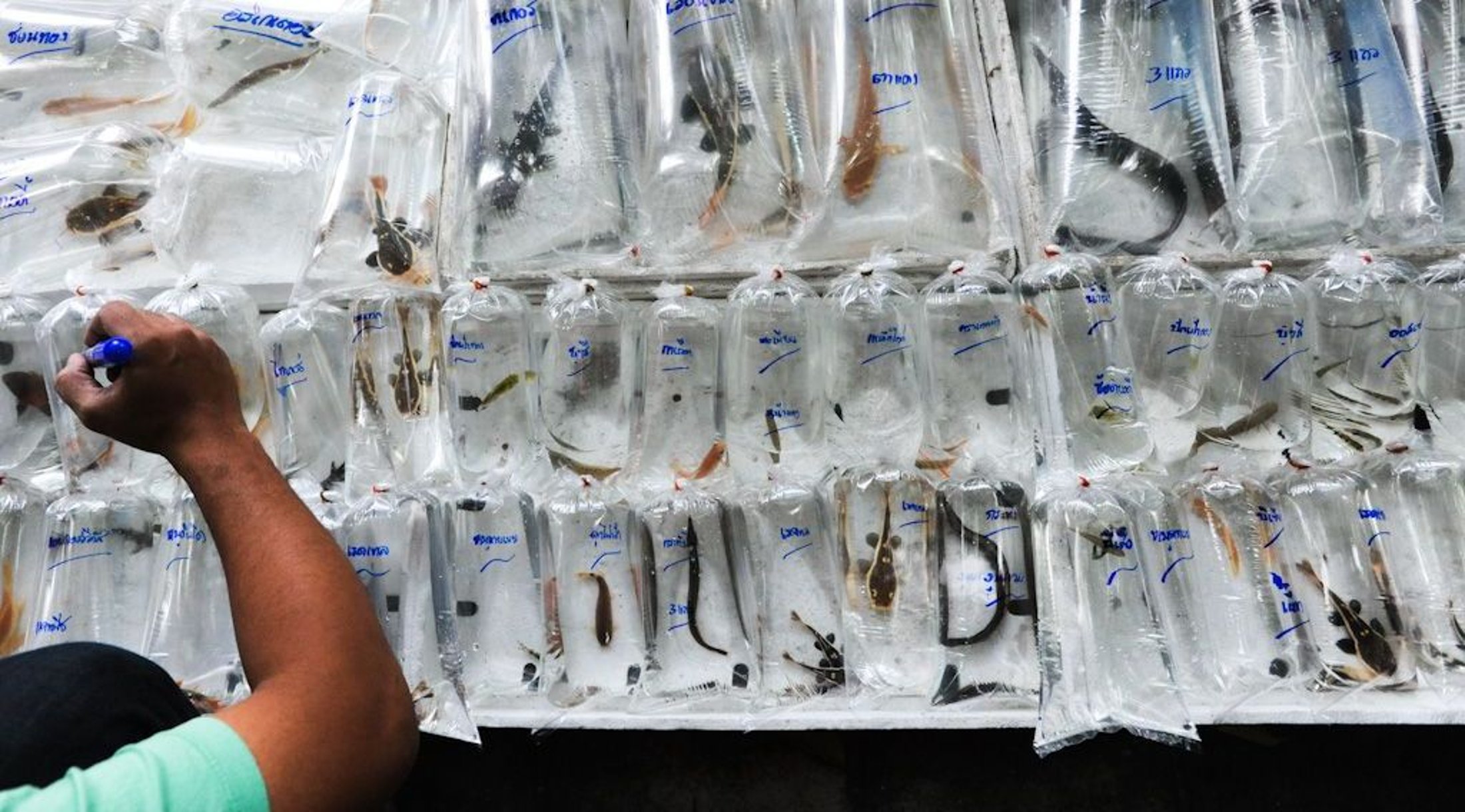 Chatuchak Weekend Market, Bangkok, Thailand, 2011. The Chatuchak market draws over two hundred thousand visitors each day and is famous for its hundreds of stalls, many of which sell live animals, most of them pets. For the length of a city block, shopkeepers had laid out thousands of fish, eels, turtles, stingrays and other animals in tiny plastic bags along the sidewalk. Some of these creatures can live up to two hours in the bag; others two or three days. Either way, many die before they're sold. © Jo-Anne McArthur