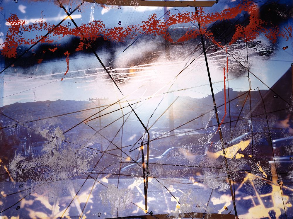 John Chiara’s one-of-a-kind mural-size camera obscura prints are luscious, moody and magical. He builds his own giant cameras (one which is large enough for him to climb inside) so he can expose light directly onto large sheets of photo-sensitive paper to capture images without needing film to act as an intermediate negative. His photos offer up ordinary urban landscapes that seem like three dimensional sculptures infused with light flares and liquid color. Somehow—through his mix of the direct process, hand-cut photo paper, filters and chemicals—everything looks real but “charged” with heightened energy.