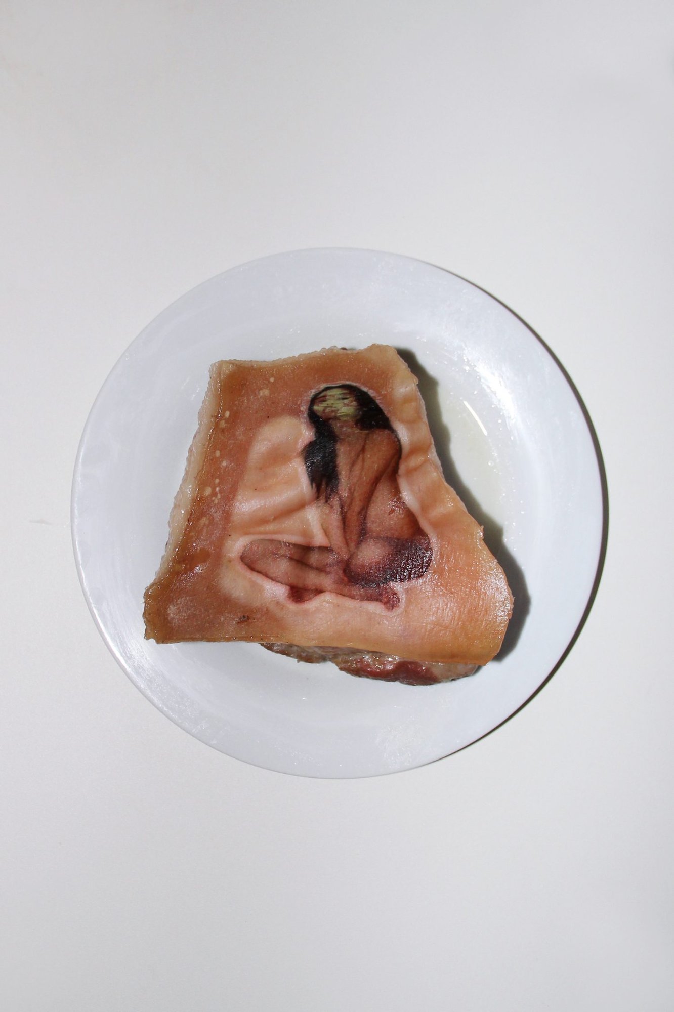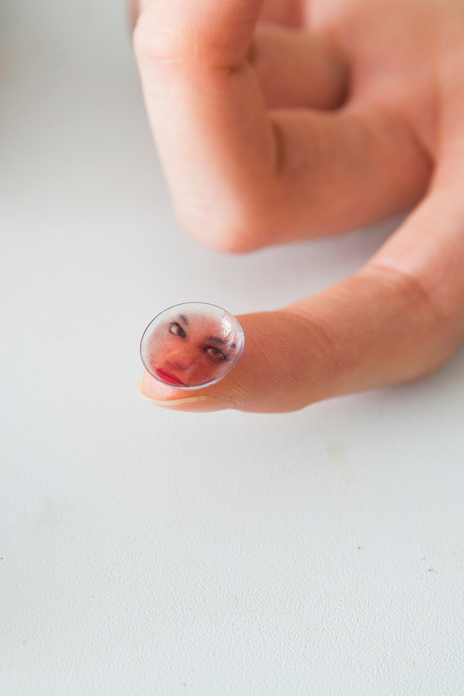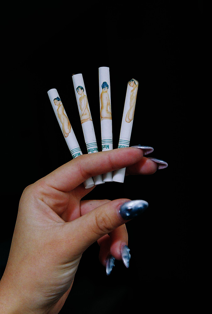 Yuyi’s work explores the body as both canvas and subject, and her temporary tattoos have seen several iterations in the years since. This includes one in which self-portraits were placed onto the flesh of raw meat cuts, and screenshots of dating app profiles put on human skin—“I was playing with putting faces on faces,” she says, probing the masks we wear to present ourselves to the outside world—and she’s since recreated it for magazine stories too. Commissions from magazines are actually how a lot of her projects come about, including one of her most recent bodies of work in which her images are temporarily transferred not upon the body, but on commonplace objects such as lipsticks and cigarettes, contact lenses and knives, as well as cut out and crafted into earrings. Each of them speaks to the commodification of bodies.