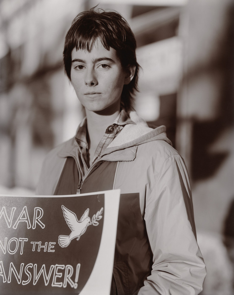 Elsewhere, Ross makes groupings based on social categories or jobs—public school kids, for example, and army veterans. In one particularly affecting section, a series of images called Eyes Wide Open collects portraits of protestors. Holding plaques, they look out, gaze skywards, or with intensity into the camera. Much earlier on, Ross shares portraits of members of the United States Congress, taken in the same way as she photographs the protestors, with the same cool eye. Out in the street or up in the offices; the politicians and the people, everyone given the same framed space.