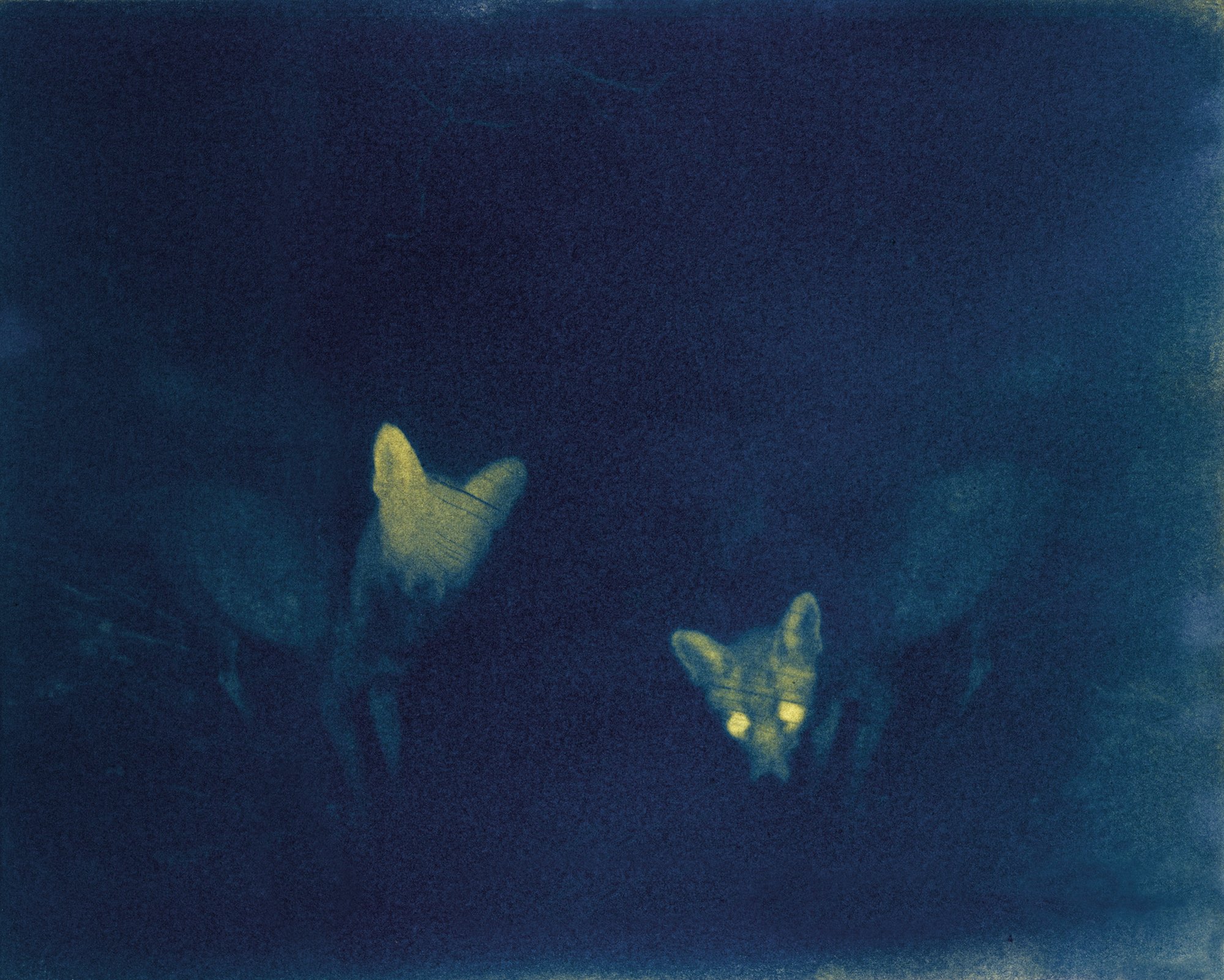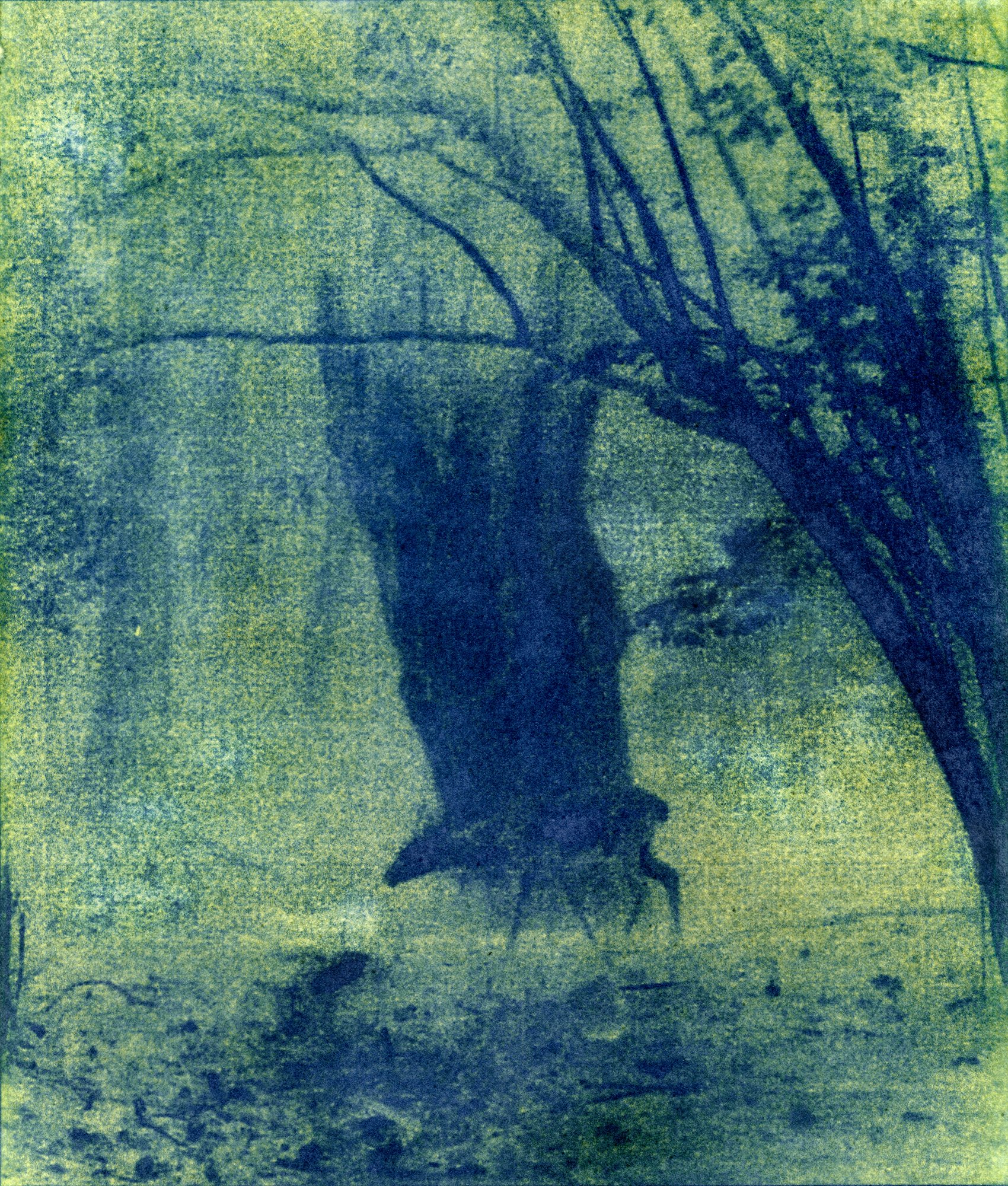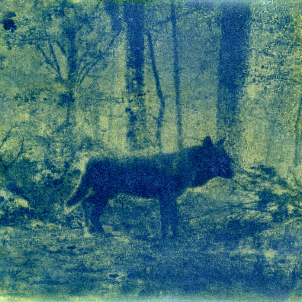 Coquentin applied a cyanotype process to the trail cam photographs. Through trial and error he ended up with a bluish, yellow coloring to the prints. Only after finishing with the project did he discover that wolves are dichromatic, and that the most dominant colors they see in is the same blue and yellow he had happened upon.