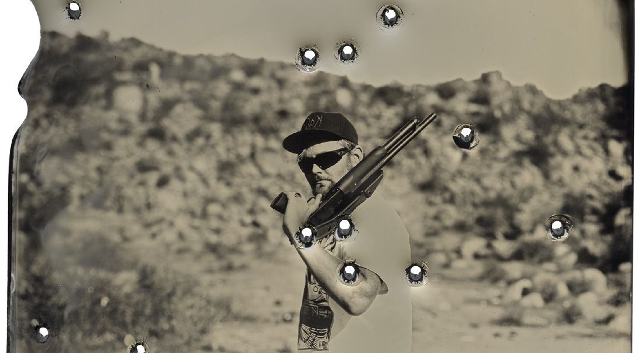 To create this series, I set up my darkroom tent and tintype gear at known target shooting locations in the Arizona desert. I meet gun enthusiast strangers and ask if they are willing to participate in my project. I create their tintype portraits, and when complete, I give them the option to use the image as a target. Some take part, leaving bullet holes in the plate. The title for this work, Shot, refers simultaneously to my use of the camera and the participant’s use of the gun.