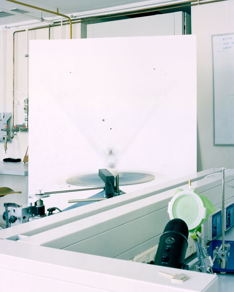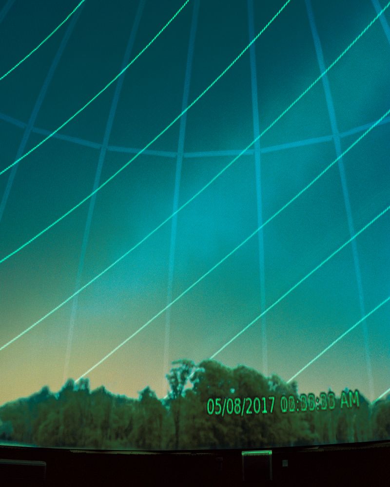 Geibl explores our reliance on science through a series of images that reveal our fascination with scientific objects – inanimate tools – that we use to help us determine major truths about human nature. The presence of human beings is insinuated, but never made fully obvious by incorporating the faces or full bodies within the environments she constructs. While some images hint at a human presence, depicting their hands working through equations or interacting with particular substances, most of the images place human invention at centre stage, so that our manmade tools act as the protagonists in the story. For example, one image, saturated in green and blue hues, is a photograph of a simulation of an entire year on Earth. “I asked a woman working at the planetarium to start a timer and simulate one year on Earth in three minutes, so this picture is a still image of that entire year. It was created with an exposure of three minutes, which is why you can see the shift of the sun. I loved the idea of capturing an entire year in one single photograph.”