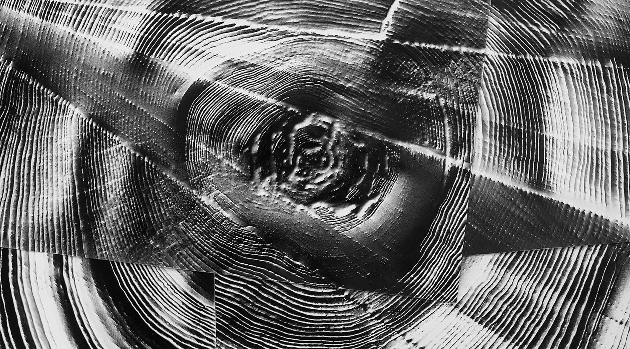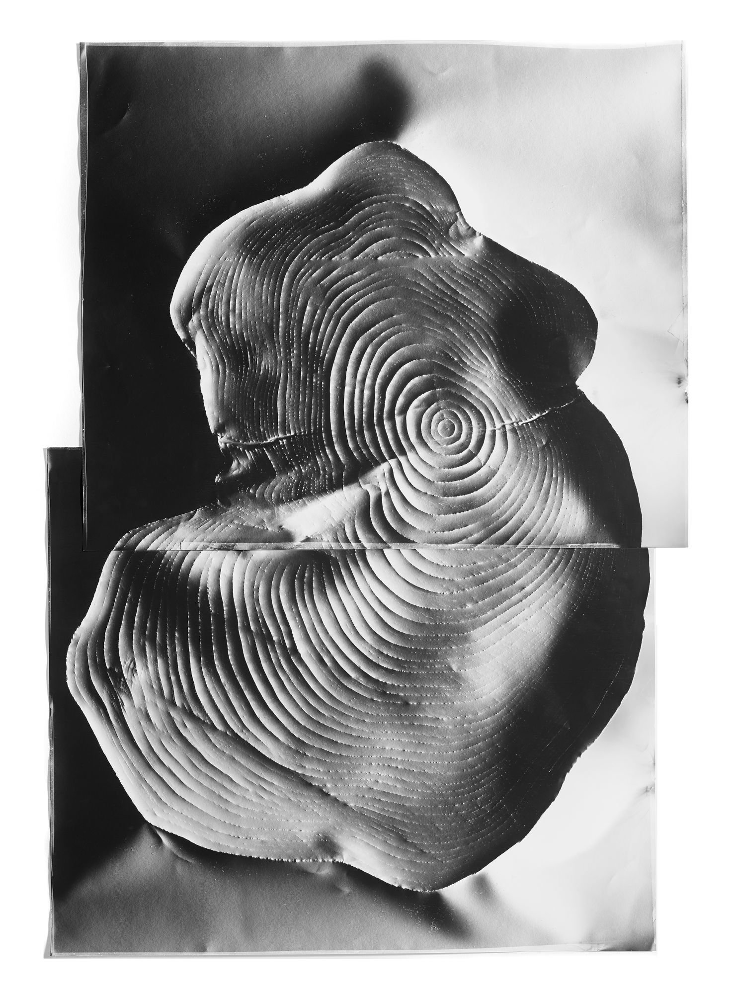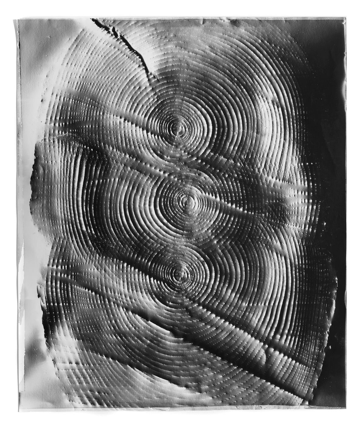 For the uninitiated, photograms use light-sensitive paper to reproduce imagery without the use of a camera. Objects are placed on the paper, which is then exposed to light. For her series “Automatic Earth,” McKenna hand-embosses the paper with imprints of tree rings, cracks in the earth, and other natural phenomena. She then shone light on the paper from different angles to capture the desired image.