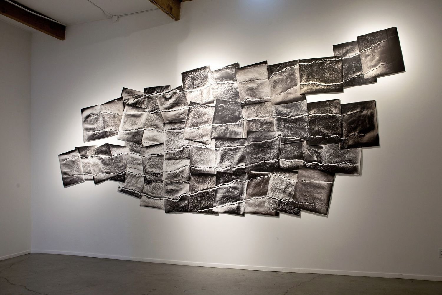 This action is part of what makes McKenna’s work so alluring; despite existing as art objects, they are also strikingly sensorial, capturing the feeling of standing in the dark as rain pelts you from all angles (as in her previous series, “Rain Study”), or a pitch-black forest. Complete darkness is a requisite for the creation of successful photograms, and this meditative environment is palpable in McKenna’s work.