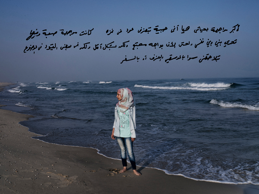 Then, the last location was Gaza. I was talking to a friend of mine who was stuck in Jordan, staying there illegally—she had been accepted to study at a university in the UK, and was waiting for her visa. Because of the Israeli military occupation in Gaza, a lot of students, men and women, receive scholarships but end up losing them because they cannot leave Gaza on time. They cannot cross through Jordan or Egypt. Among the universal basic human rights, the right to education and freedom of movement are particularly important for me. In Gaza, most people are deprived of both. During my stay, I met four women dealing with the complicated process of getting travel permits. Their stories reflect how they patiently dealt with the uncertainty of their situation in a place that barely has time to breathe between wars, and how they handled the anxiety and anguish inherent in these unpredictable contexts. I asked them: why is it important to continue your education? Through all of these women, you get a sense of hope, of solutions. Women need to be more involved and, when you give them the opportunity, they can do a lot.