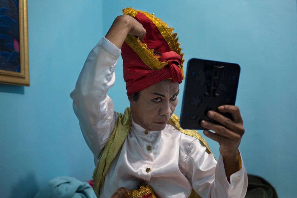 Bissu Wa Nani prepares for a performance of traditional trance dance at a cultural event. Malino, South Sulawesi, Indonesia. November 26, 2017. © Magda Rakita. Nominated by Max Houghton.