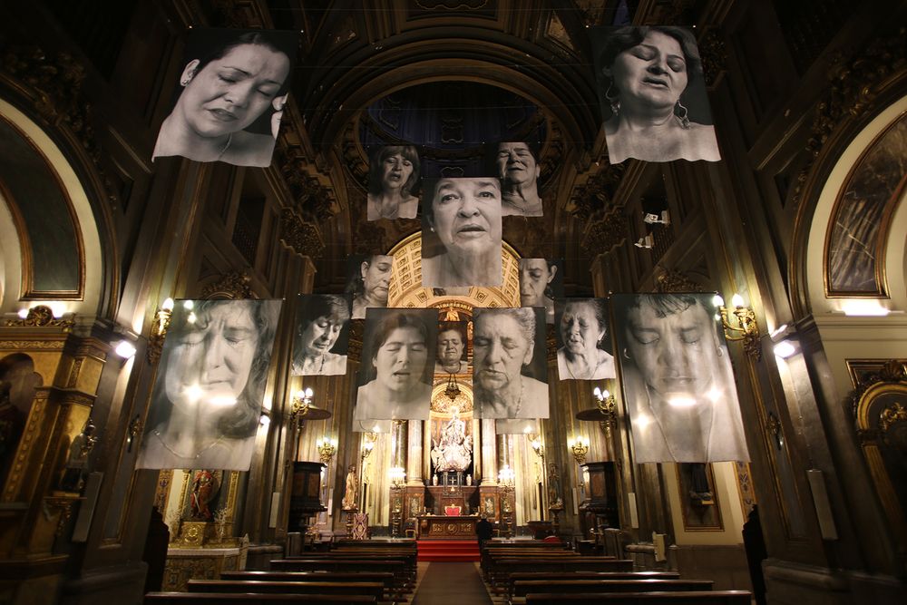 Installation shot of the series “Sudarios / Shrouds,” exhibited in the Iglesia de San Francisco in Madrid from February 24 to March 3, 2015. The series consists of black and white portraits of women who are victims of armed conflict in Antioquia, Colombia. © Erika Diettes. Nominated by Anne Wilkes Tucker