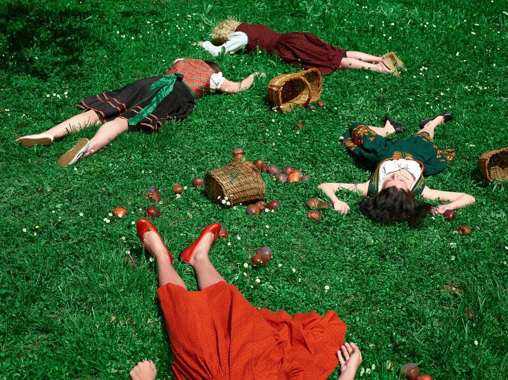 In this image a group of poisoned women lie on a grass field. This image re-enacts a situation in which a poison contaminates a group of farmers. © Guia Besana. Nominated by Arianna Rinaldo.