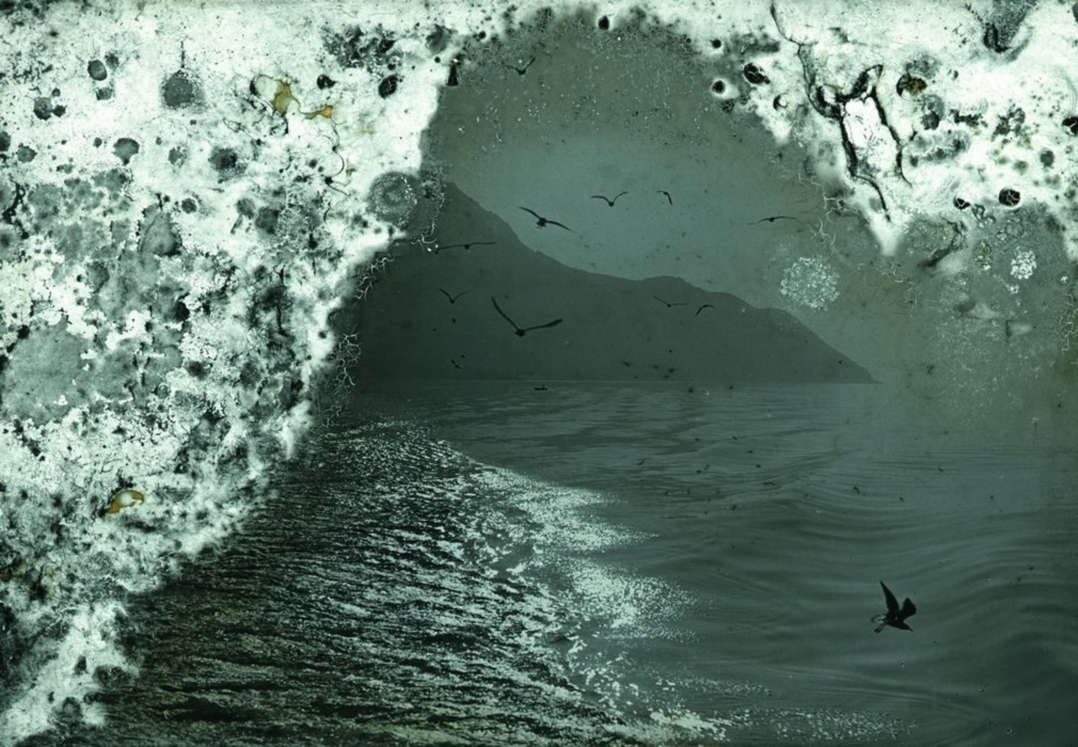 A photograph of a forest fire at night is encroached from the edges by white mold. A seascape of breaking waves has mold sweeping across it like foam at the edge of a beach. A mountain landscape where mold has arisen like a flock of white birds taking flight. A starry sky with mold spreading below, wild and churning like a desert storm. Trees and plants have attracted wilder blooms to superimpose themselves like vivid psychedelic visions.