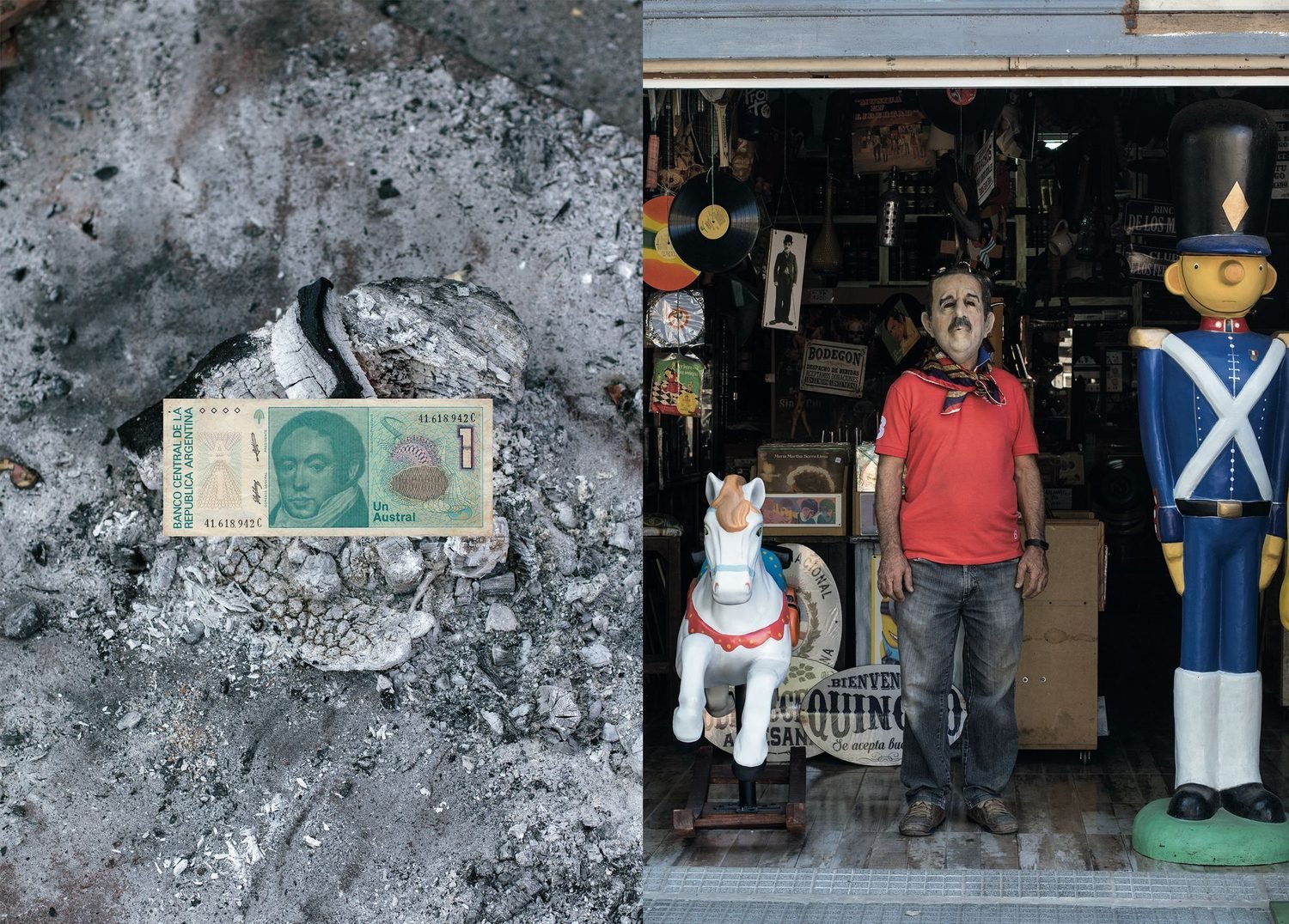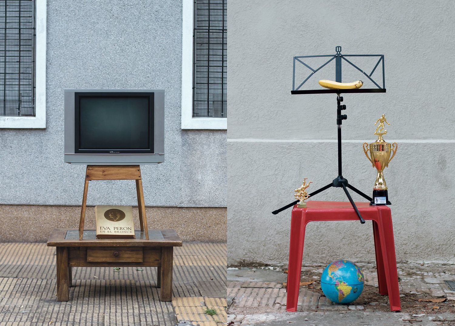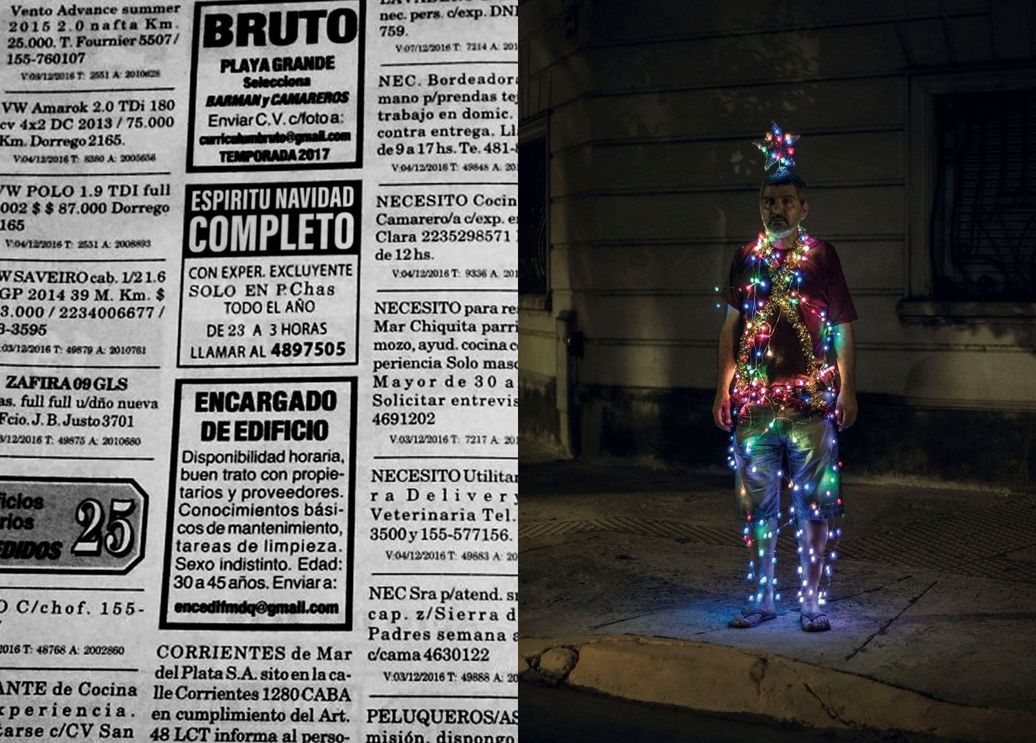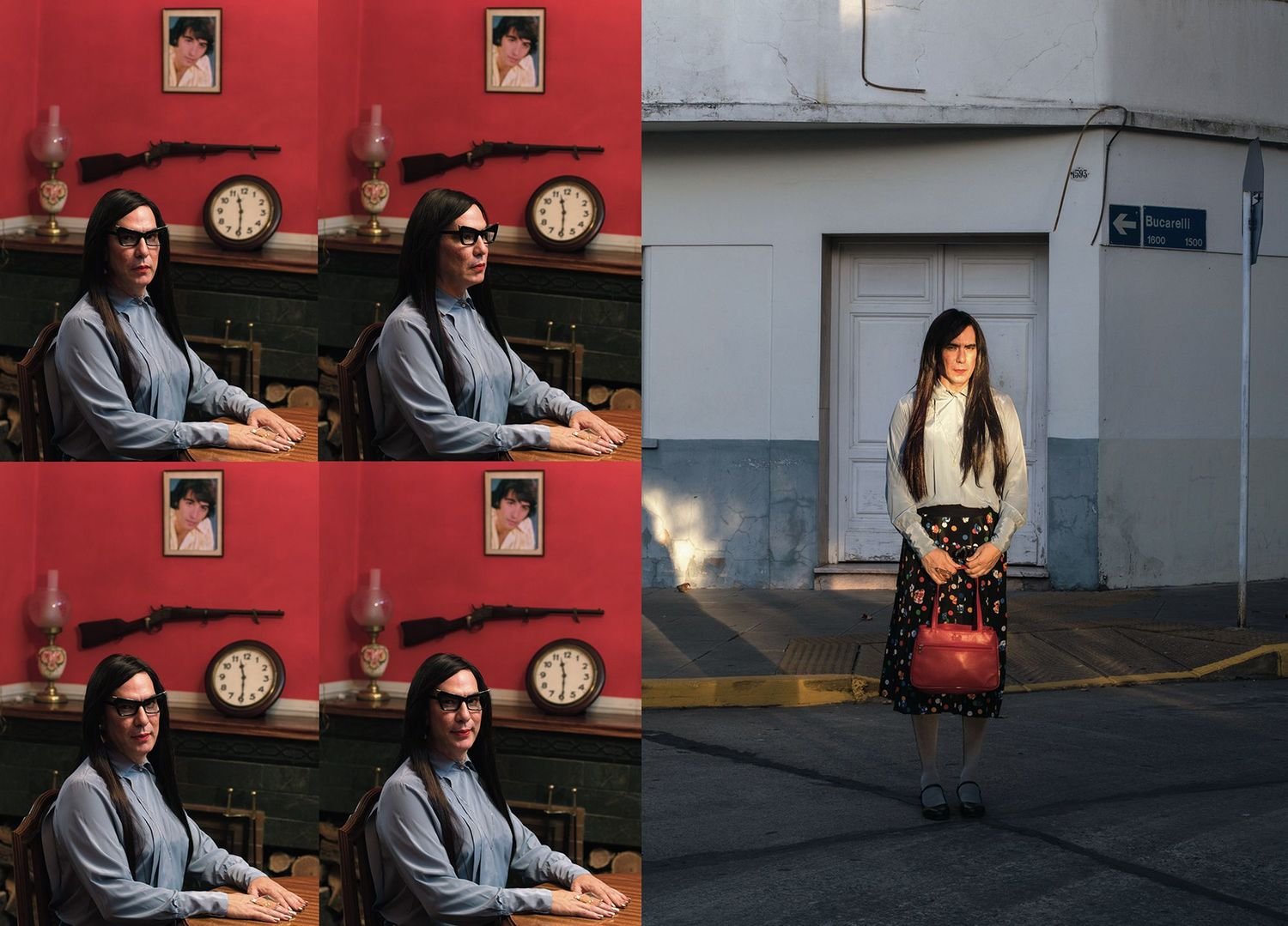 30 years ago, a popular comic book featured time-warped situations and sympathetic characters who lived in the neighborhood: “Everything that you ever lost in life, exists in Parque Chas.” Using that as his inspiration, Cobelo freed his own imagination looking for magic, uncanny coincidences, signs and omens, as he wandered the streets of Parque Chas, discovering among other delights, a series of seemingly impromptu totems constructed from discarded household junk, and characters standing in the streets wrapped in twinkling colored lights. There’s some cross dressing, some recurring jokes, and some darkness, too, including a portrait of a woman lying on top of her bed, fully dressed, holding a sawed off shotgun as if prepared to defend herself against imagined hostile intruders.