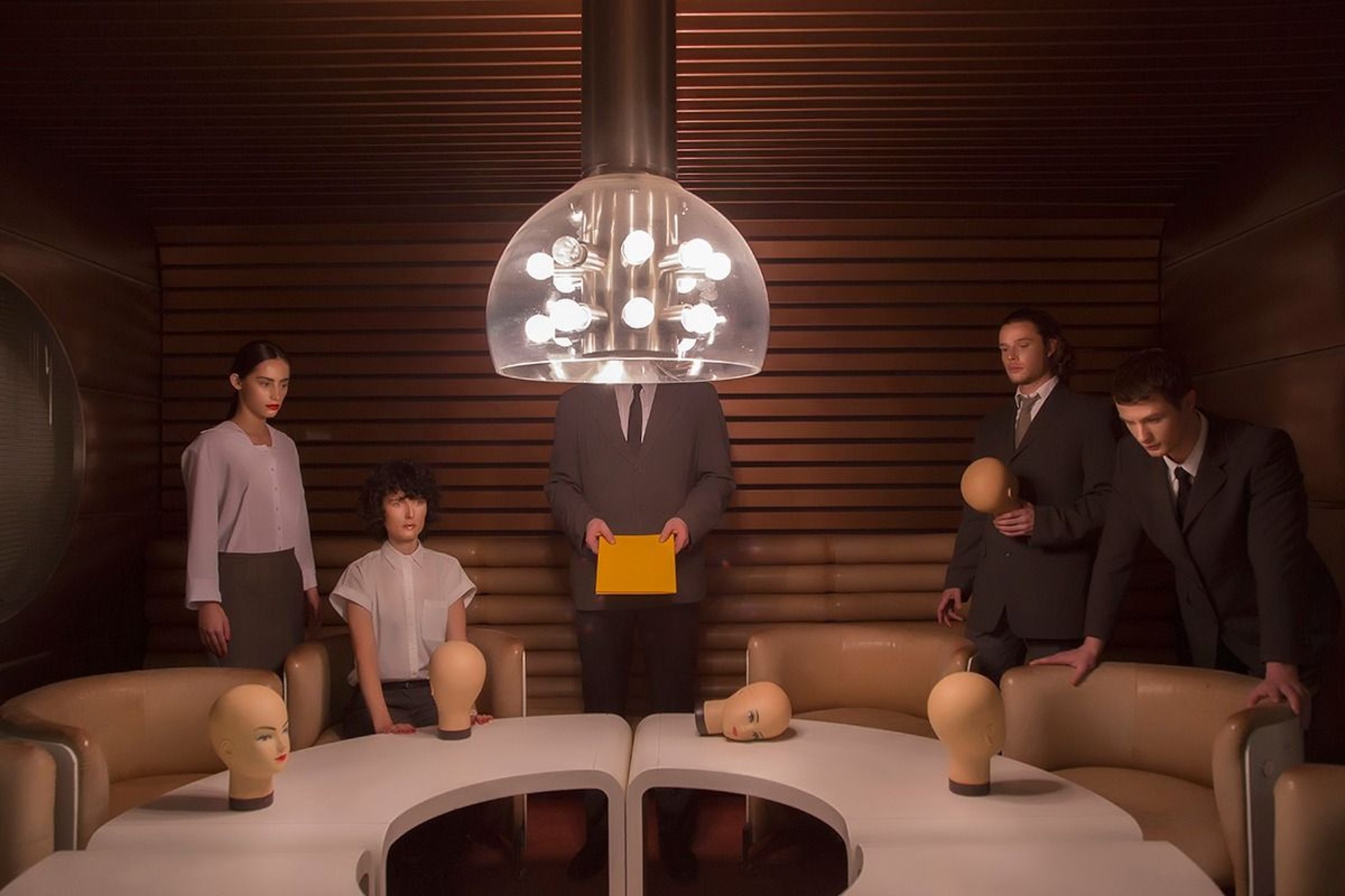 The use of mannequins in certain images give the work a “meta” quality. What is the difference between the models and the mannequins? In “Factory,” the mannequins stand off to the side, unclothed and without hair, yet equally as stiff and emotionless as the models who assemble them. In “Discussion,” one model holds the detached head of a mannequin, and considers it.
