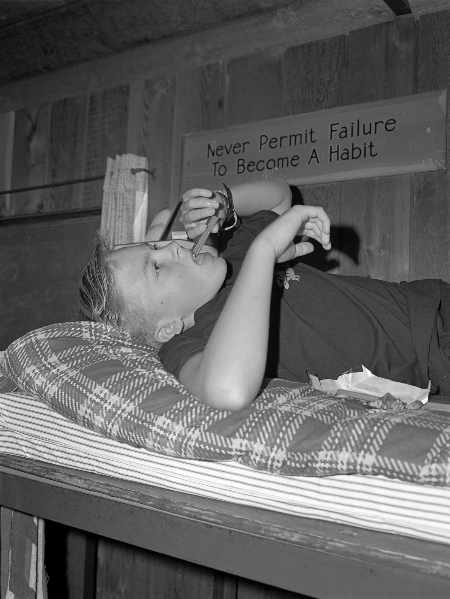 With the timelessness of his black and white photographs, Steinmetz captures the physicality and emotional vulnerability of adolescence. A child is still small in the world, the emotions poignant, less constrained by time. In the small, private world of summer camp, the securities of home are replaced by the rustic setting of cabins with bunk beds and screen doors, while flashlights replace reading lamps and firelight replaces television.