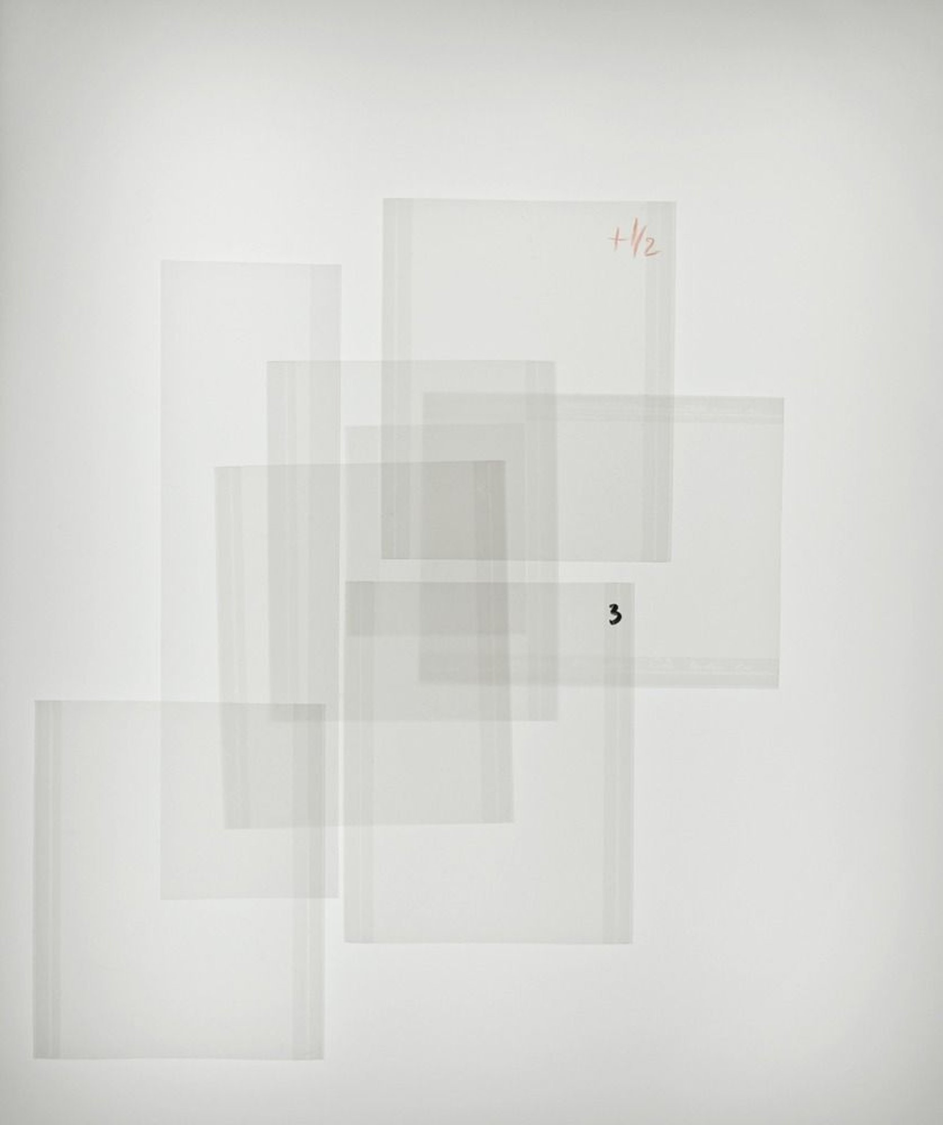 Bartley’s works are marked by a distinctly minimalist aesthetic. Bartley’s series Push 2 Stops, a group of pictures of empty photo sleeves arranged on a lightbox, calls to mind Malevich’s Suprematist paintings, his iconic White on White in particular. The compositions borrow freely from the conventions of abstract painting, while their components, the vacant sleeves with their handwritten annotations, take on an elegiac quality. With Paperbacks, she engages the physicality of stacked paperback books to create spare, sculptural compositions. The books are anonymous—their covers and text can’t be seen, only the blocks of their pages. The subtle variation in hue between the different “whites” of the pages is reminiscent of Agnes Martin’s muted color fields.