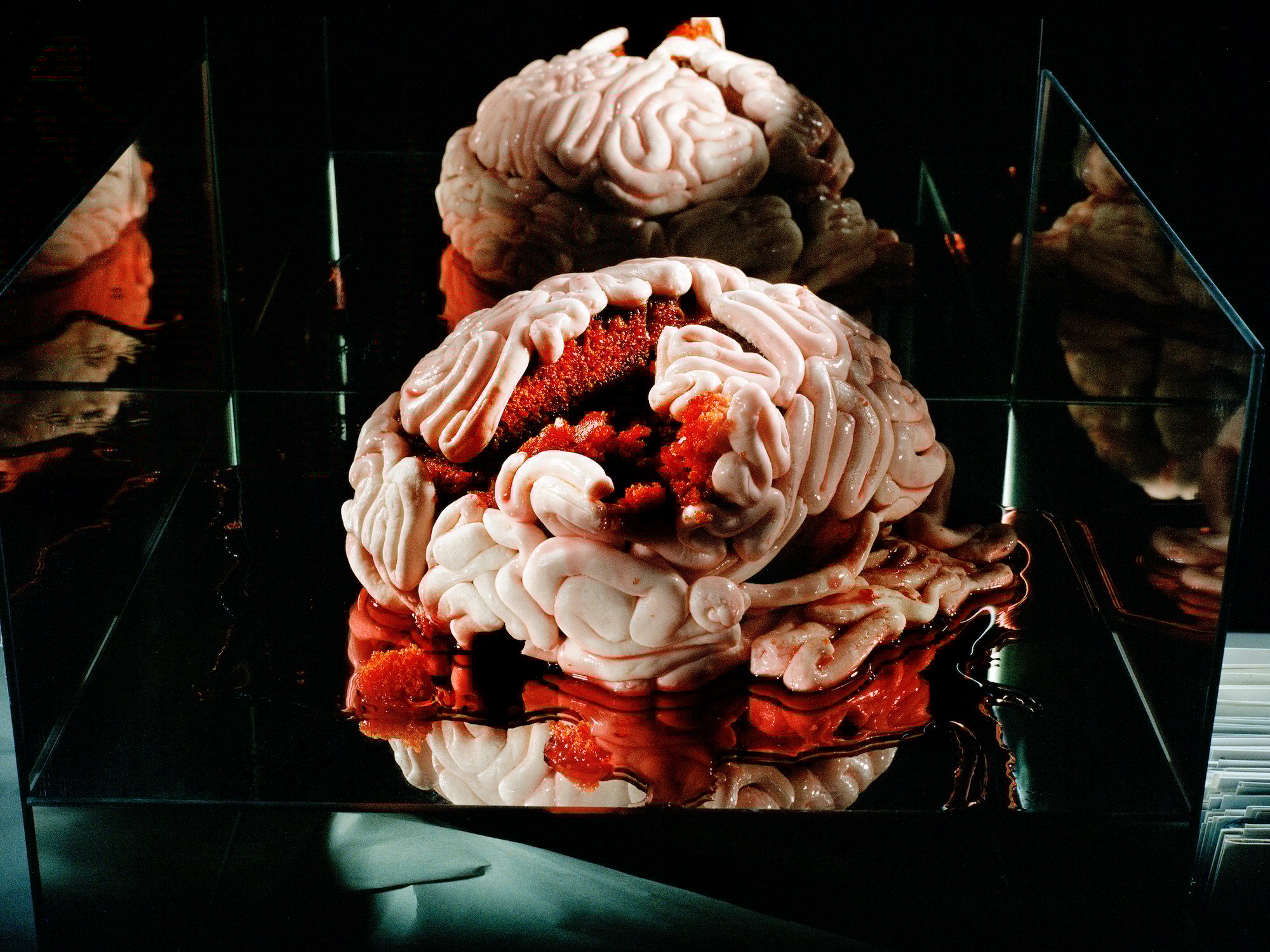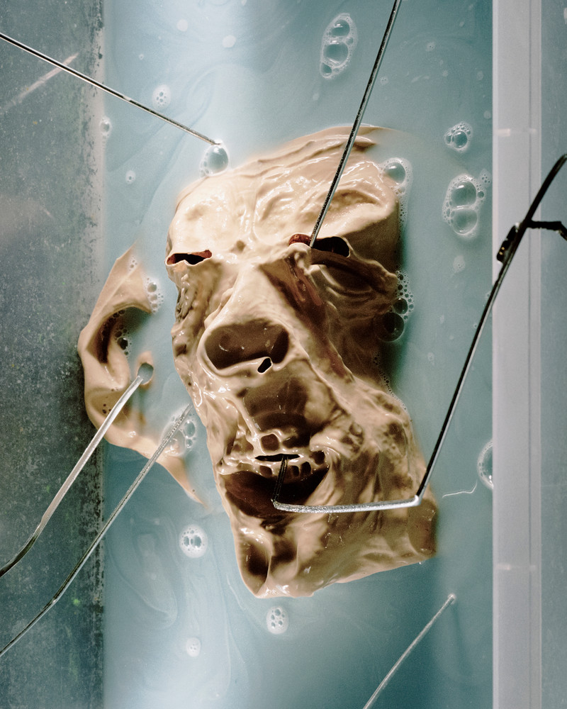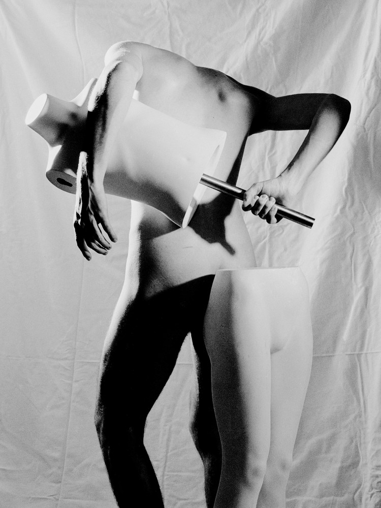 The images in Everything Goes Dark a Little Further Down are weird and playfully, deliberately perverse. An array of body parts are seen in fragments throughout—torsos appear without arms, feet crush heads, bodies contort, faces melt, brains explode. In one self-portrait, the artist has manipulated the photograph to make his head appear severed but alive, his eyes still alert and staring into the lens. In another, he holds a mannequin, kissing it, and in it that act creates his own, disturbed version of a mirror image—one side flesh and blood, the other soulless plastic.
