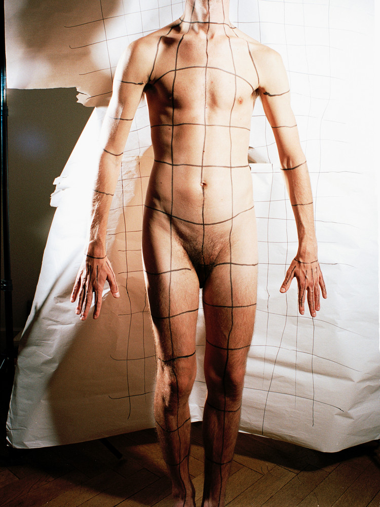 Elsewhere, Croizier draws a grid across his body in thick, black marker, echoing pictures from the medical and pseudo-scientific archives he spent time devouring for research. “The body is primordial in this work,” he says. “Our own body is the most ordinary thing to each of us, and yet the most secret. Bodies are beautiful, unique and political. In reference to anatomical iconography, I try to deconstruct normative representations of the body, with a view of asking questions such as: to what extent is a body a body? How can it free itself from the norms that constrain it?”