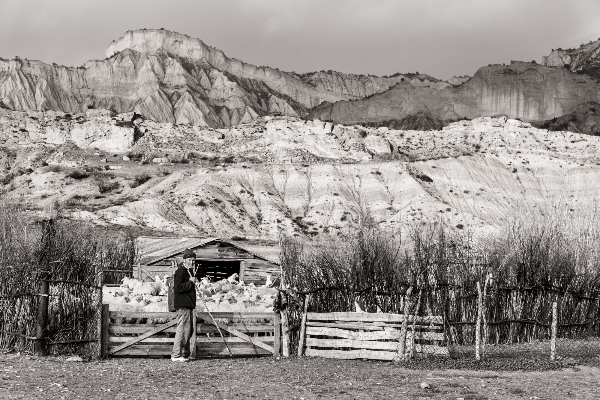 This openness and generosity have set the stage for Wolf’s immersive, detailed black and white photographs. The experiential aspect of his work is important, allowing himself to become accustomed to a space in order to fully depict it. He captures time, from the fading images tacked up over layered wallpaper in shepherd’s huts to the ancient ritual of migration, updated with plastic cups, cell phones, and the odd logo on a jacket. A viewer can hear and smell his images—the hiss of a single light powered by a car battery and the odor of wet wool and clouds of dust haunt his photographs.