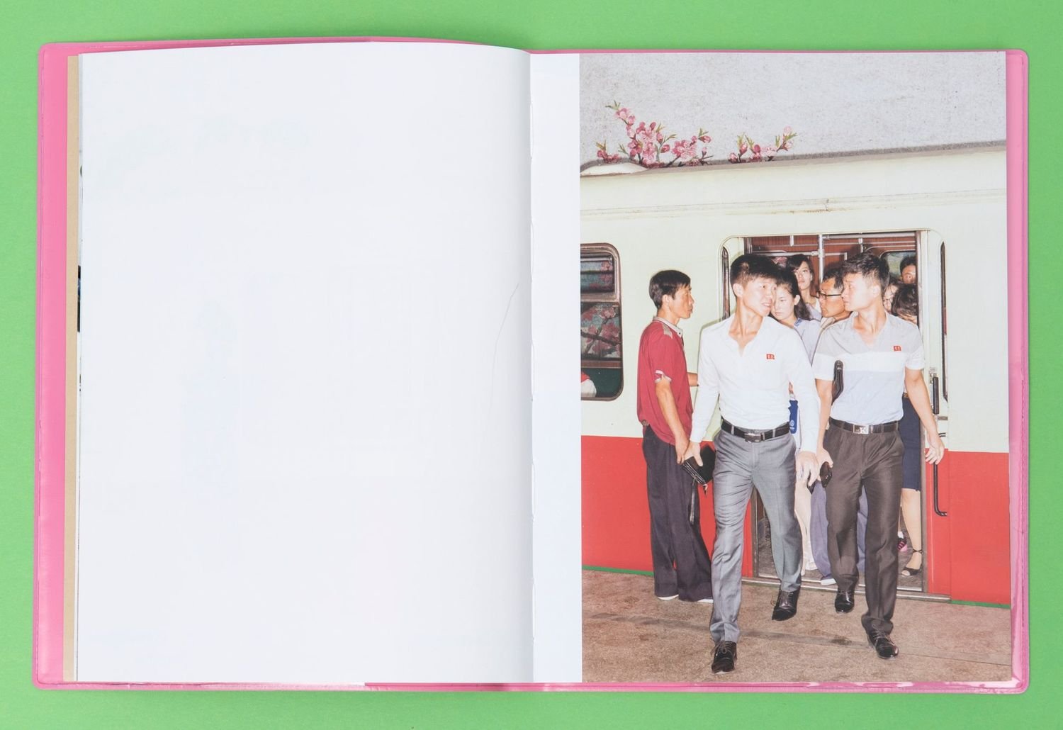 Visually, Pinckers reveals and conflates these complex layers through a number of aesthetic choices that are now synonymous with his personal style: intense flash that releases his subjects from the traditional documentary lighting that we are used to ‘trusting’, and curious framing that isolates gestures, glitches, and those moments just before and after what is conventionally interpreted as ‘the money shot’. He captures candid memories—side glances, exchanged grins and rogue shrugs surrounded by magnified decor—rather than posed stoicism and grand, all-encompassing informational scenes. And while his images of the DPRK were originally commissioned for The New Yorker, Pinckers has also brought them together with a handful of other images in Red Ink, a photobook released in late 2018. Published in an edition of 850, Red Ink’s plastic cover is light pink—a color that surprisingly crops up a lot throughout Pinckers’ images of Pyongyang, on people’s clothes, furniture textiles and matching decor. A ‘Kimjongilia’—a flower named after the late Kim Jong-il—appears on the cover, subtly alluding to the potential subject matter of the photographs contained within.