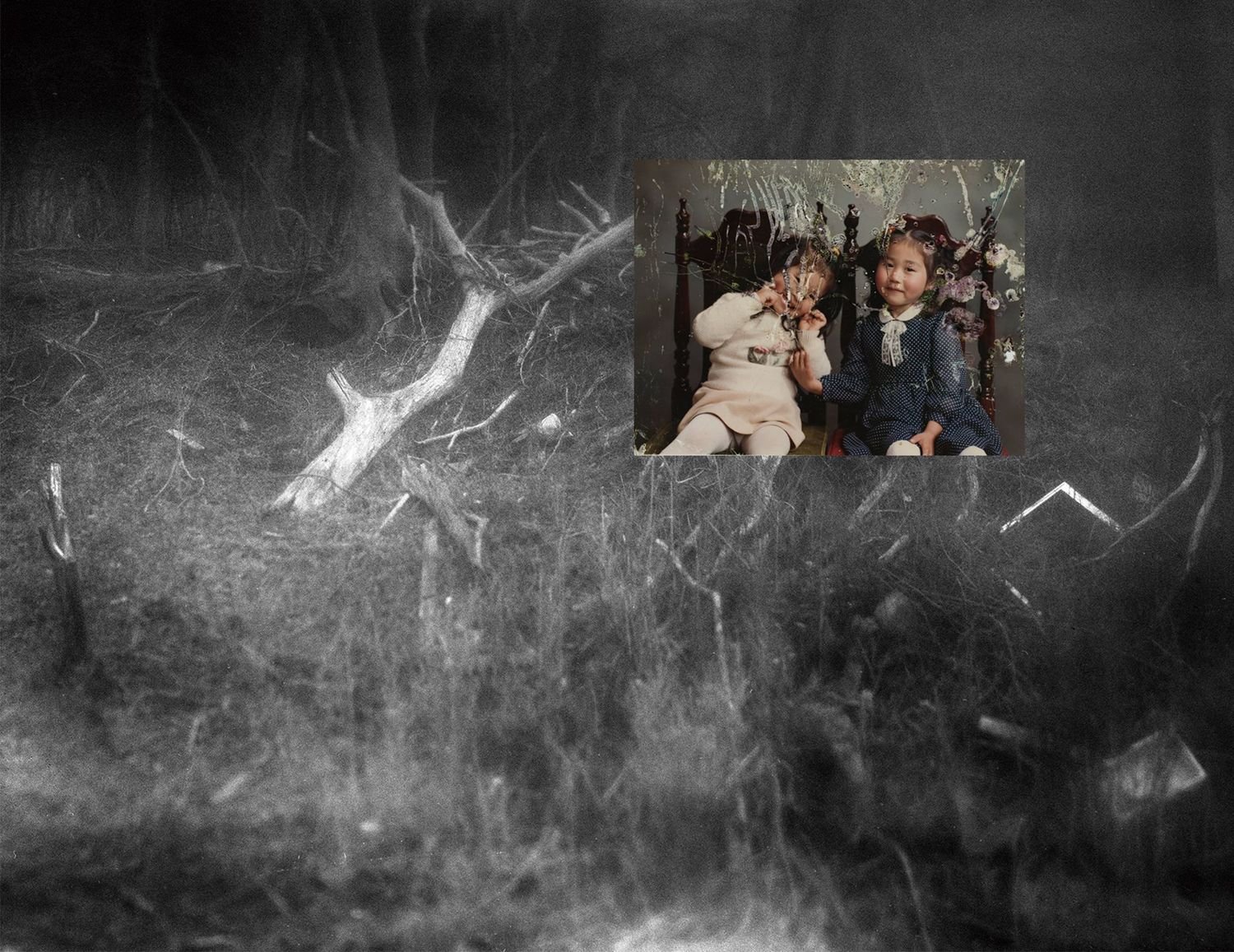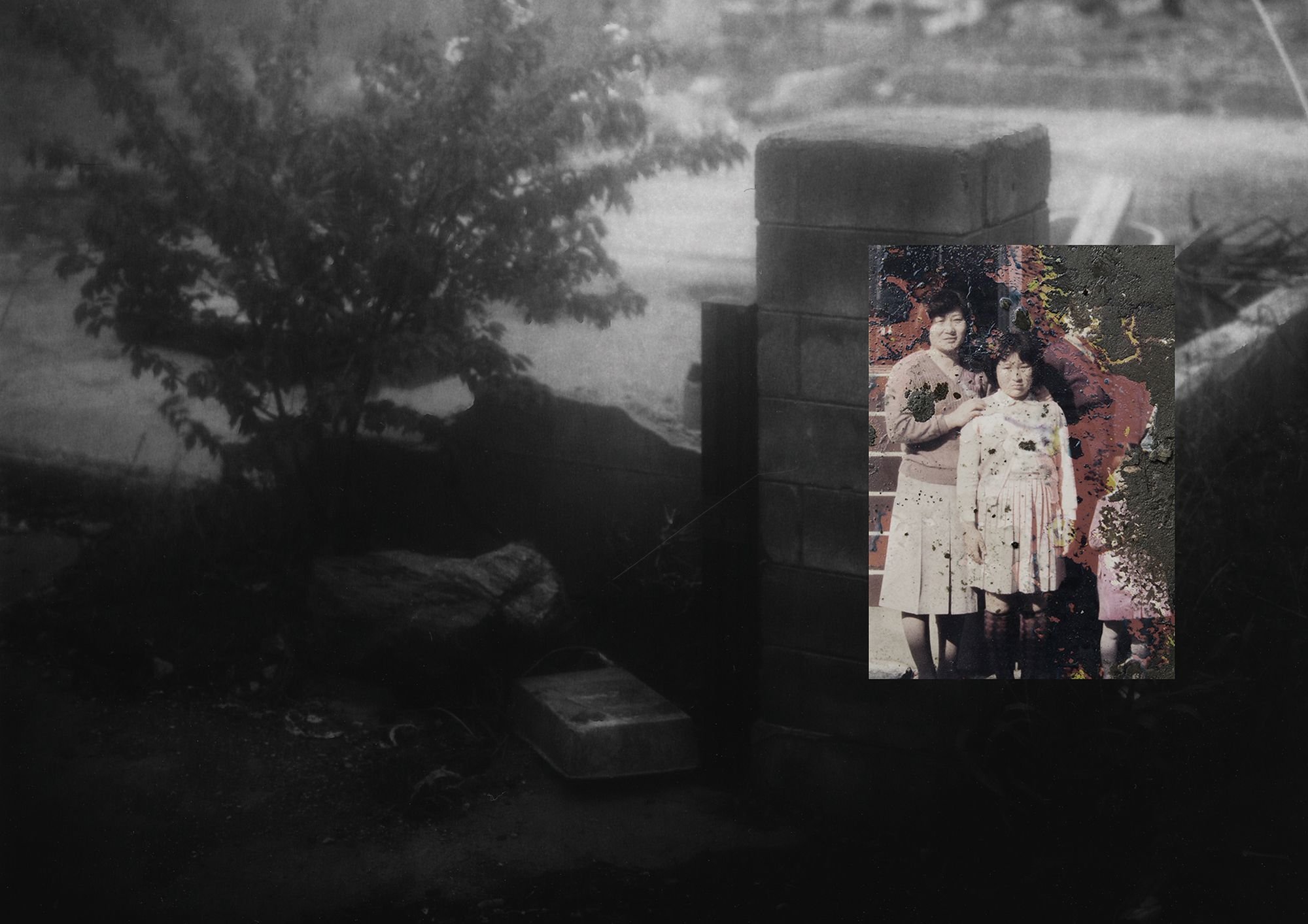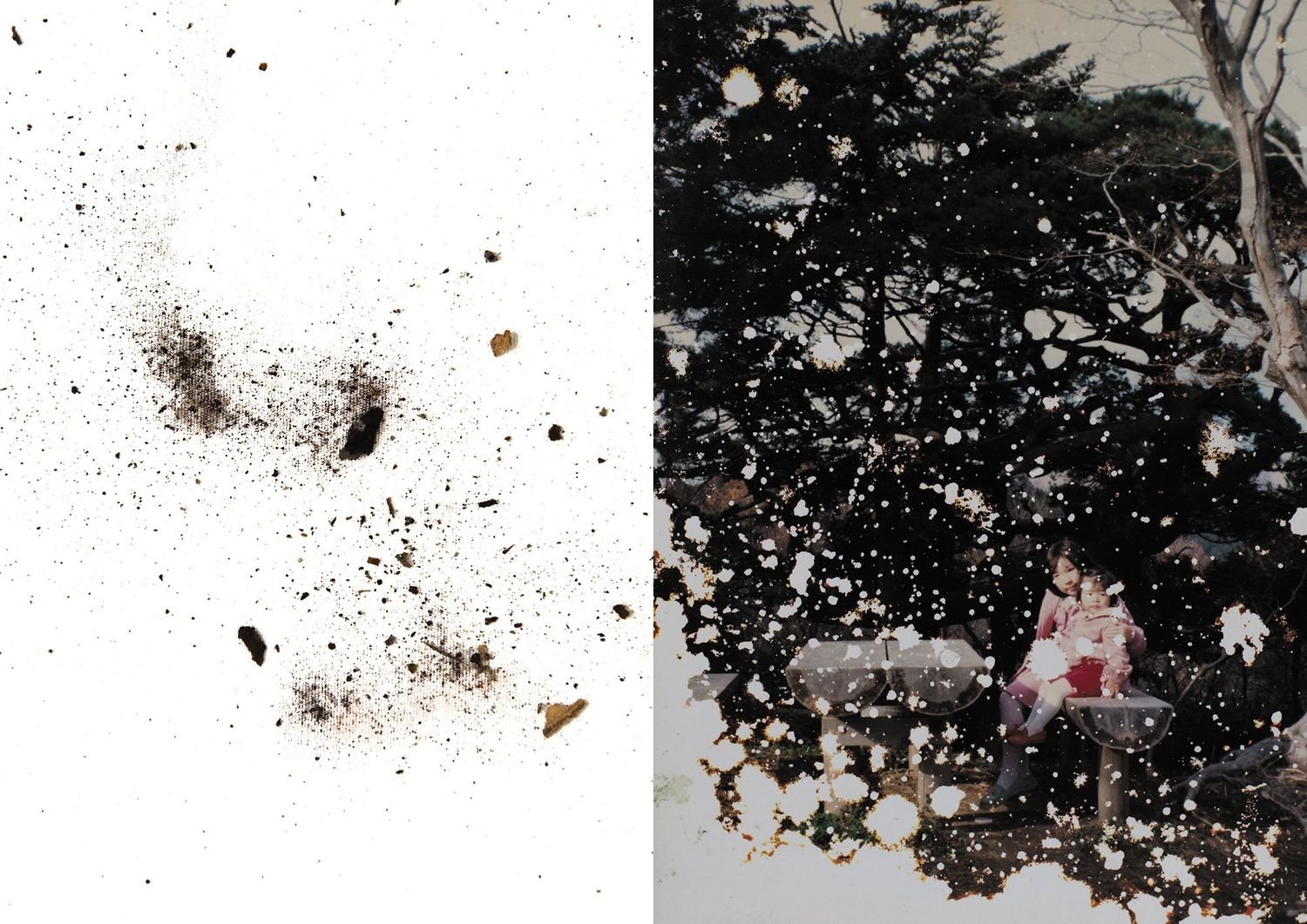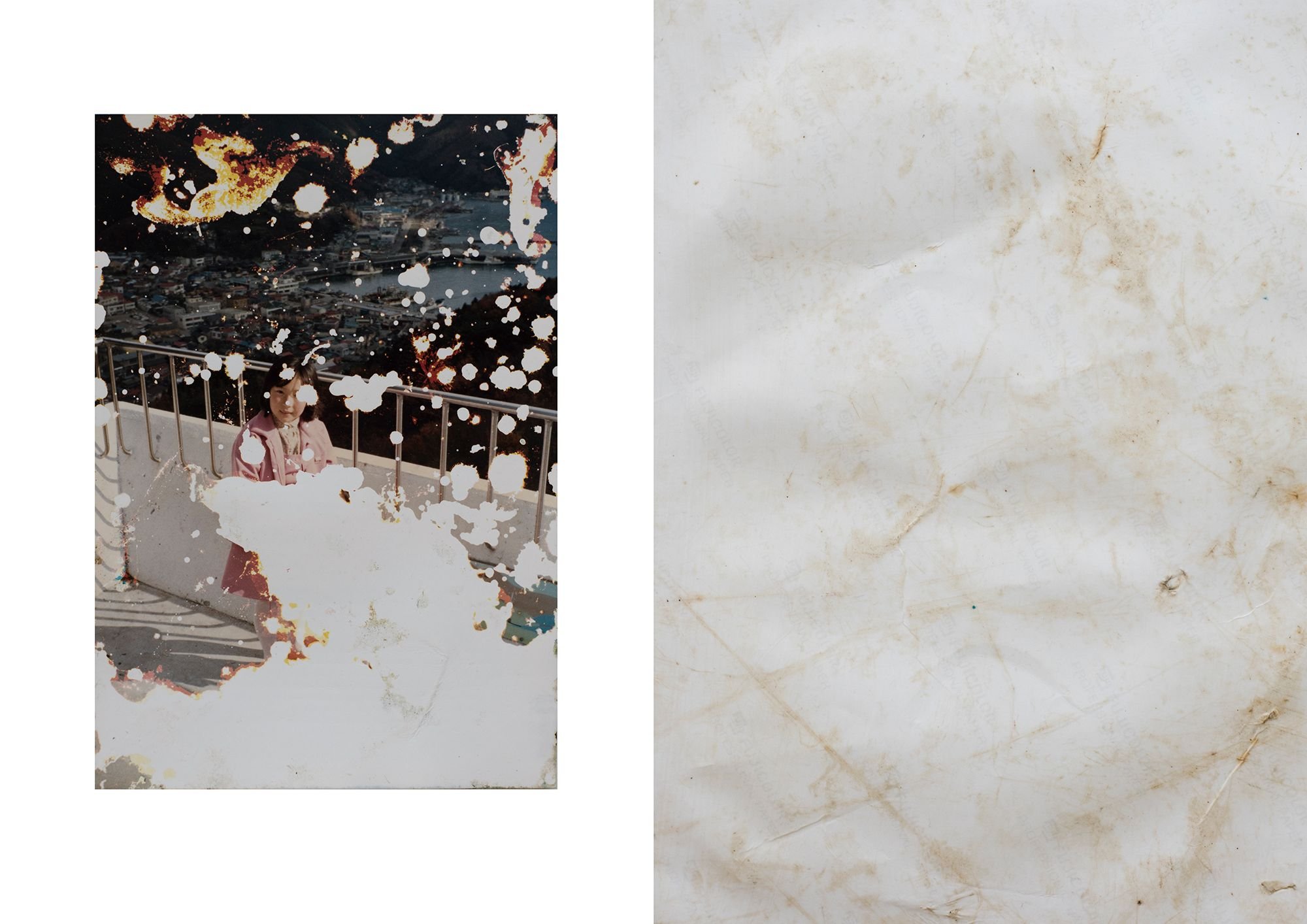 The family snapshots I found were washed white, the images slowly disappearing. The portraits taken by my father were stained and discolored. These scars are similar to the damage seen in my town—similar to my memories, which I am slowly losing. I hope to retain my memory and my family history through this book. By arranging these photos, I have attempted to reproduce it.