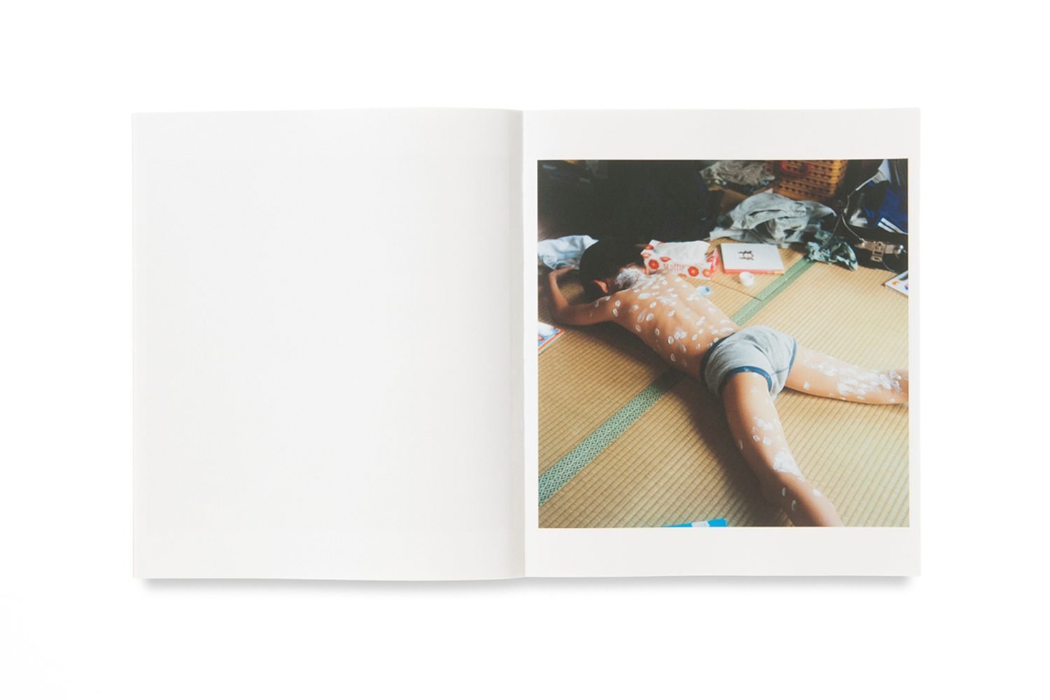 Playing up to its title, Small Myths by Mikiko Hara begins with a few small moments plucked from daily life. Cut flowers in a vase in the sink. A little boy—the photographer’s son—splayed out on the floor, his back covered in dots of cream. Sausages frying in a pan. Then, a beige curtain hanging in front of some trees. Flowing one after the other, these minor scenes carve out significance, a quiet power growing as they come together to form a rhyme of domestic life. The next photograph is a vivid blur of orange flowers, moving us into the city where we come across a sequence of faces, a flurry of different people in transit.