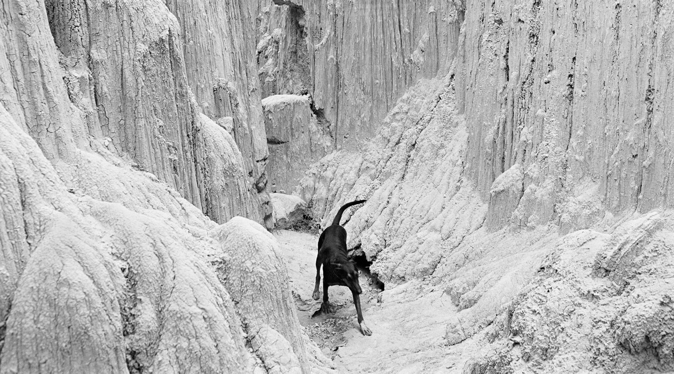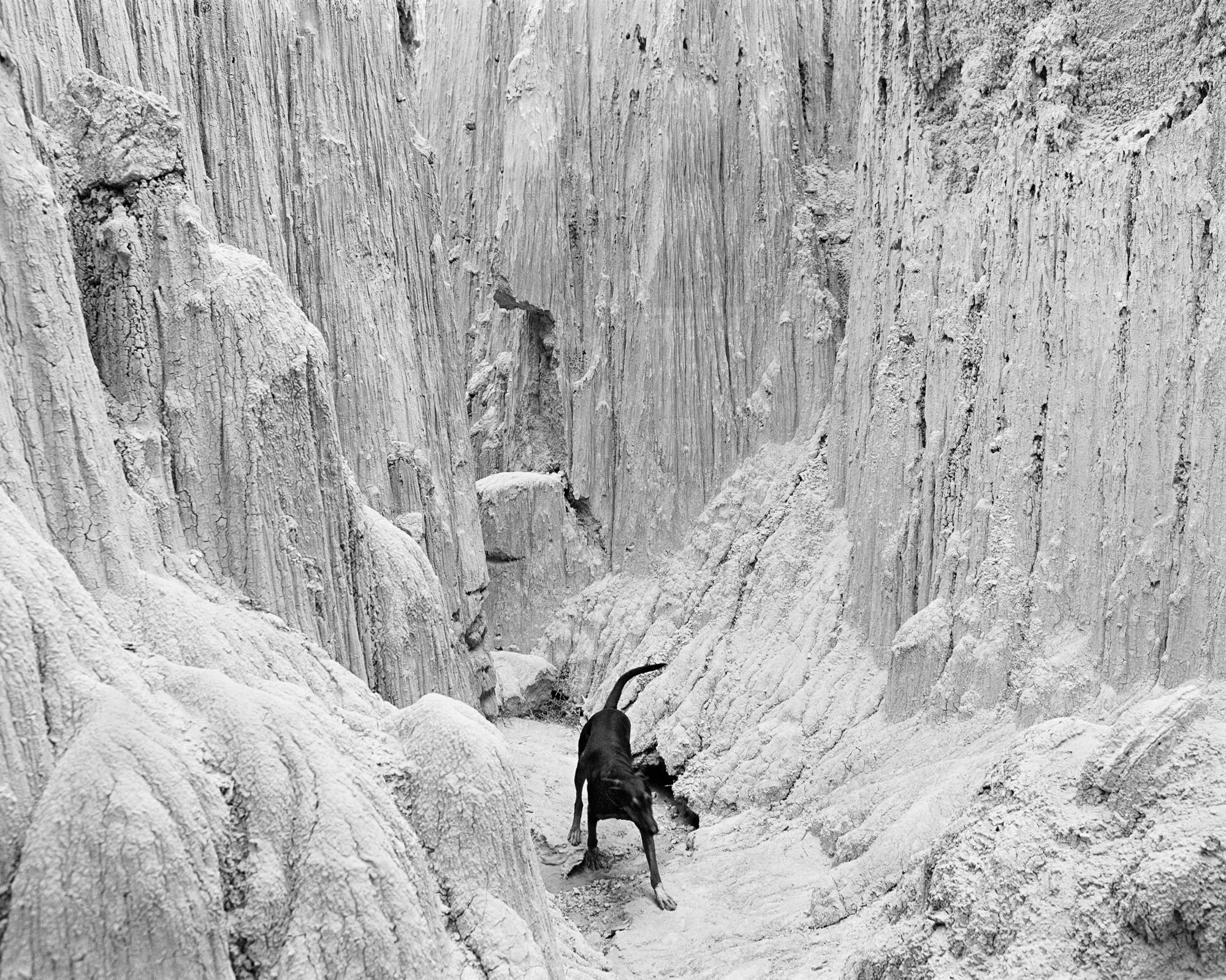 A burned-out landscape portrays devastation. A black dog isolated in a bleached-out canyon that looks like it’s in the Ice Age seems apocalyptic and menacing. Interleaved with war’s prototypical mainstays such as tanks and missiles are the back of a girl, who in brushing her curtain of hair echoes the shroud, the waterfall of hair—silvered by Plumb’s flash—covering the back of the woman on the back cover. The accidental effects created by using the flash off camera add to the sense of disquiet in the photographs, and reflect Plumb’s feeling of the world’s being off-kilter.