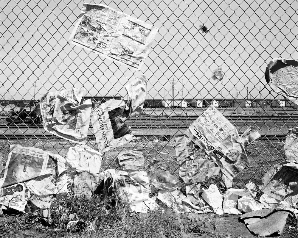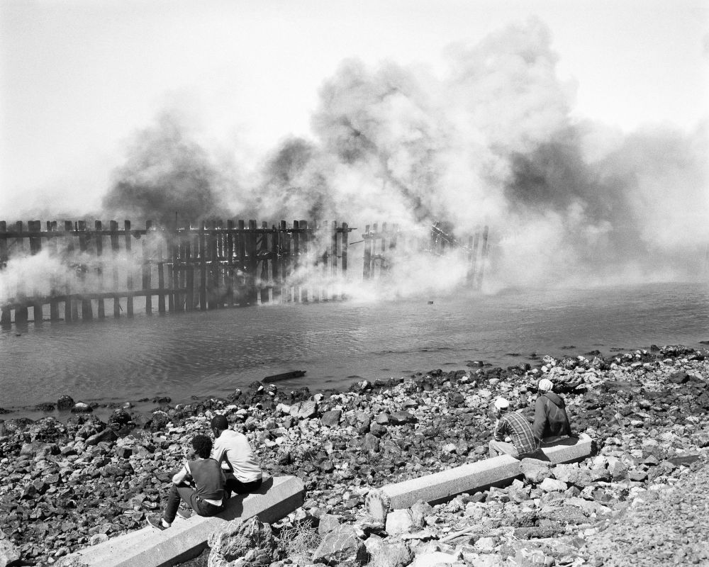 Plumb acknowledges that the work is resonant of images and narratives of the Grimms’ Fairy Tales that were part of her childhood. The book’s text begins: “I remember having insomnia for a time when I was 9 years old. My mother told me there might be a nuclear war.” That threat reappears in these photos of toy tanks; of four men sitting on a beach, nonchalantly watching a fire on a pier; newspapers and refuse slammed against a fence; a soldier in camouflage gently holding the back of a boy’s head as a woman (his mother?) stands in front of weaponry.