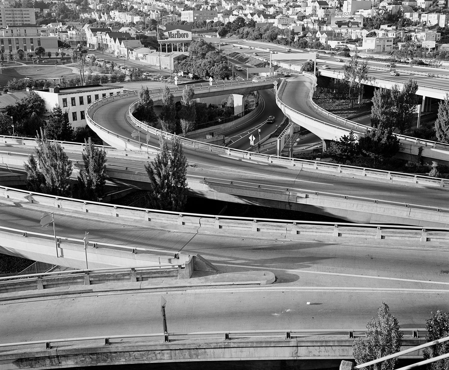 From here, the images weave down through rooftops and power lines, over networks of roads, and finally, right into the center of the city, onto busy streets where people congregate in the shadows of glass skyscrapers. With balloons in the background and people climbing traffic lights to get a better view, a protest or perhaps a street party appears to be taking place. This middle section of the book is full of overpasses and freeways, billboards and commercial signs, people hanging out on the sidewalk, couples embracing, ramshackle houses and derelict gas stations.