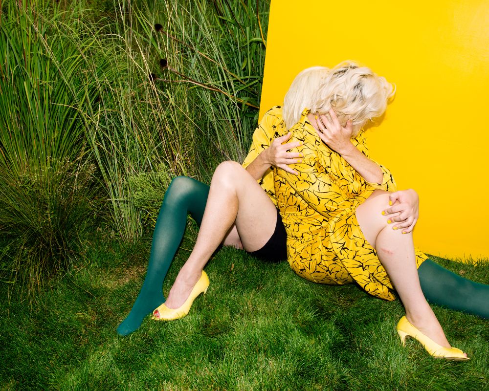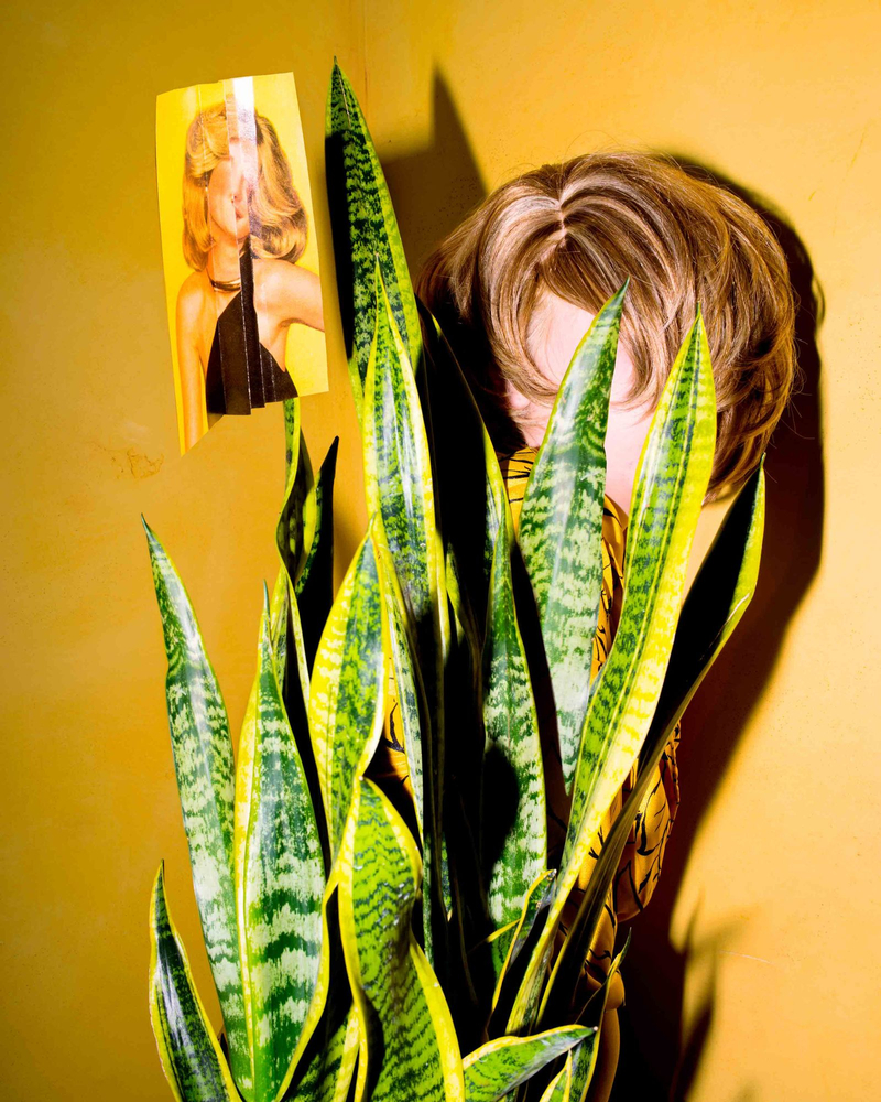 There’s a photo titled “Spread,” which depicts two people sitting on the ground with their legs positioned to look like the subject is only one woman with her legs open. Our eyes struggle to make sense of the image and to catch the trick. Another photograph titled “She Has Such an Expressionless Face” shows a woman, who indeed appears to have no face, hiding behind a houseplant commonly known as Mother-In-Law’s Tongue. In both of these images it is the details that ground us. We can recognize houseplants, mown grass, and the same yellow dress. The props remind us that the optical illusion we’re seeing is actually human.
