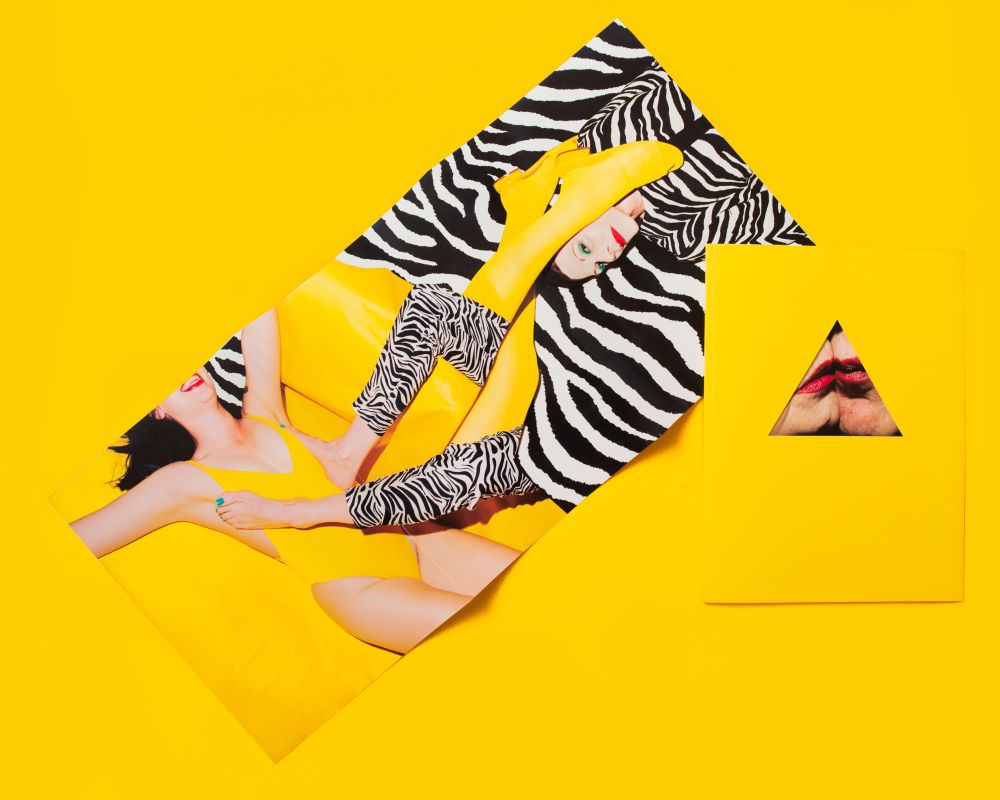 If the surface is the first thing I noticed when looking at Natural Deceptions, it’s no accident. The collection of images in this book tackle assumptions around beauty standards, motherhood, and the idea that what is visible is actually real. The image peeking out from the triangle-shaped cutout on the cover shows two pairs of lips touching, but the subjects are still turned towards the viewer. Both mouths have a thick coat of greasy, magenta lipstick, and until you pull back the front cover, it’s difficult to say whether this is one woman with her mouth pushed up against a mirror or two women embracing. In fact, the title of the image, “My Mother’s Parents,” reveals that the lips belong to Krick’s grandma and grandpa. These are the tricks Krick plays on her audience. Like nesting dolls, her photographs open up and become duplicitous. These games and layers make Natural Deceptions feel like it is growing; like it is capable of changing between viewings.