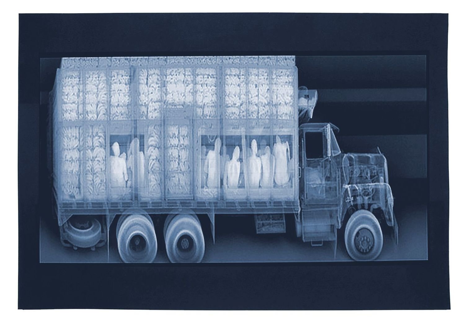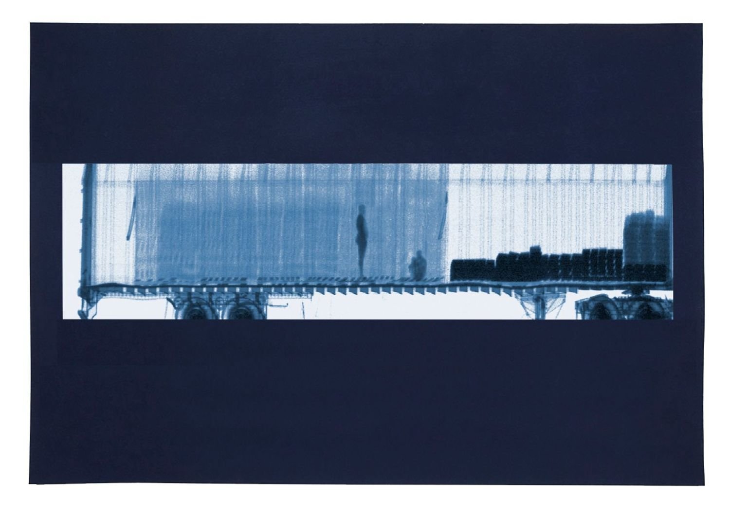 In order to overcome the limitations of these classic stylings, artist Noelle Mason creates a different type of visual work to address the lived experience of undocumented immigrants in the USA. Searching through online databases of digital images, including “backscatter” x-ray photographs, she appropriates seemingly mundane, technical shots and develops them into her own unique pieces. Intrusive x-rays from Border Patrol are printed as cyanotypes, referencing the technical foundation of photography, and are then brought together with hand-woven tapestries that depict areas of conflict at the US-Mexico border—photographs originally made by a satellite.
