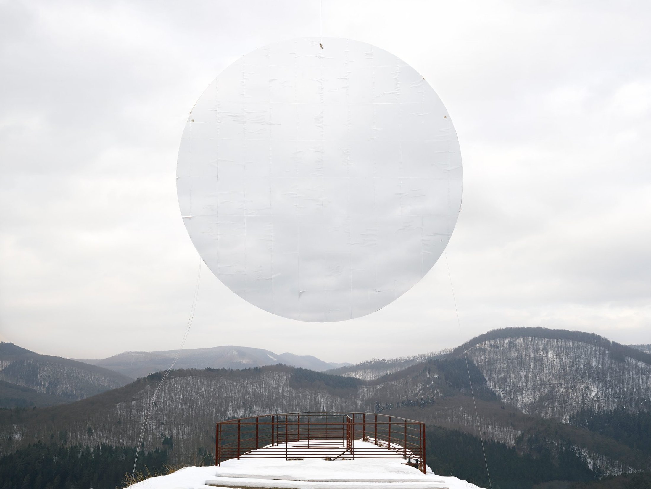 The majority of images focus on a central circle or abstract monument. The focal point of our curious eyes is held, enticingly, by a massive object that hangs in the frame thanks only to the flimsy support of delicate string. These embedded structures reveal a telling relationship between mankind and mother nature: our irrepressible imagination leads us to actively recreate and replicate elements of the world around us but at the same time, our insignificant creations are dwarfed by the true expanse of the ever-expansive natural world.