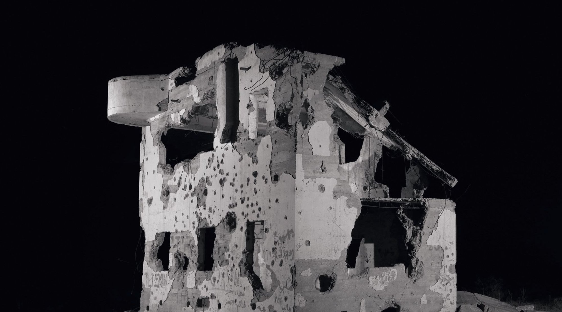 Shooting in the depths of the night takes Matalon’s abandoned subjects out of the realm of straight documentary, dousing them in a distinctive emotional aura. The conspicuous absence of people or other forms of life in these images heightens their post apocalyptic quality. This narrative is dramatized by Matalon’s atmospheric lighting, which creates an uncanny feeling in the viewer. This darkness also strips his structures of their scale. In his images, the bullet-riddled buildings with missing walls and exposed plaster could easily be miniature scale models of themselves. With this dioramic effect, the buildings become like objects of desire. The viewer is drawn to their beauty yet repulsed by their grotesqueness.