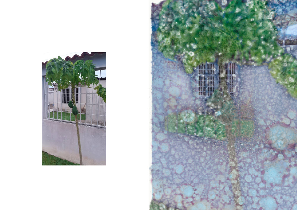 However, there was one image that struck me the most: the banana and papaya plants located at the entrance and back of the house, which I had completely forgotten about. They had not been part of my memory and the idea of home I constructed at a distance. So I decided to manipulate them using a corrosive process. In the book, some of them are paired with the digital originals, while others stand alone.
