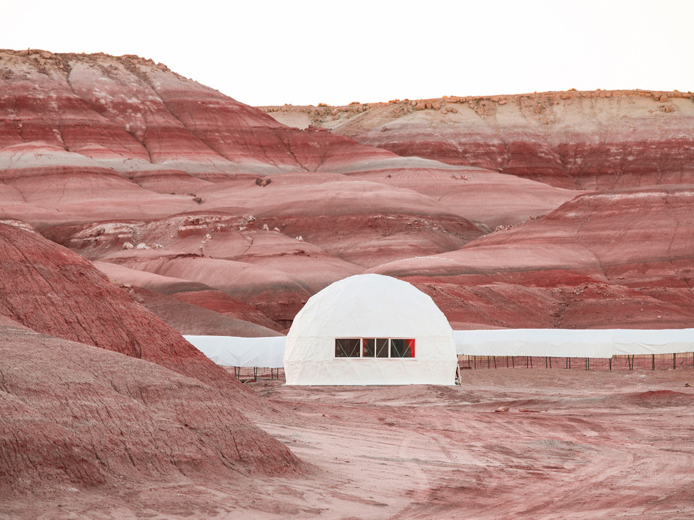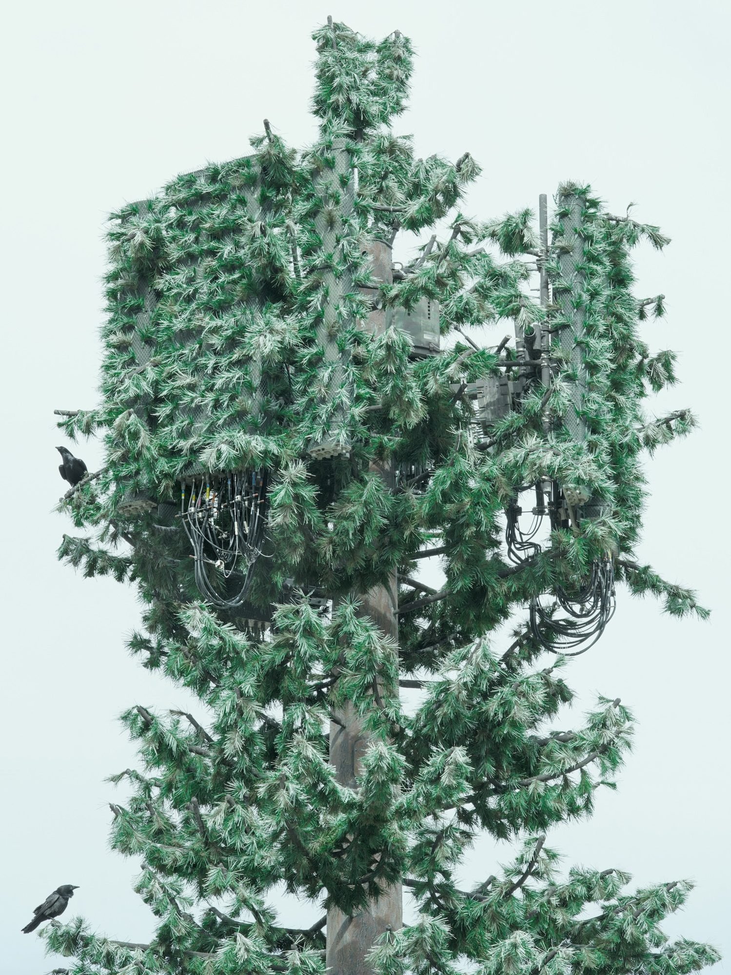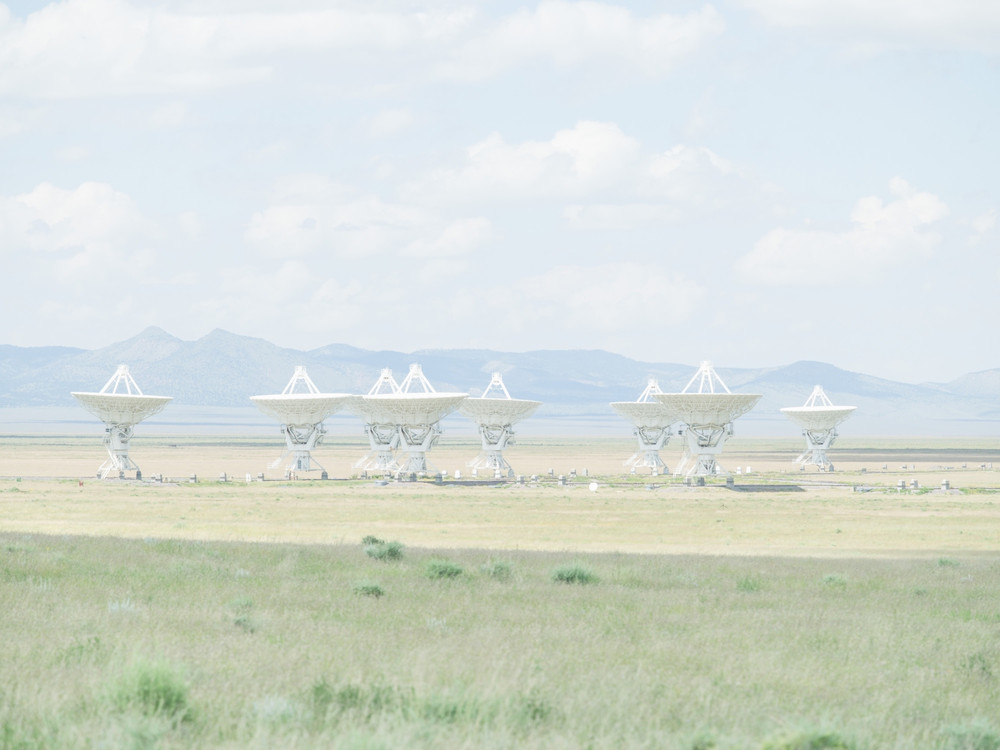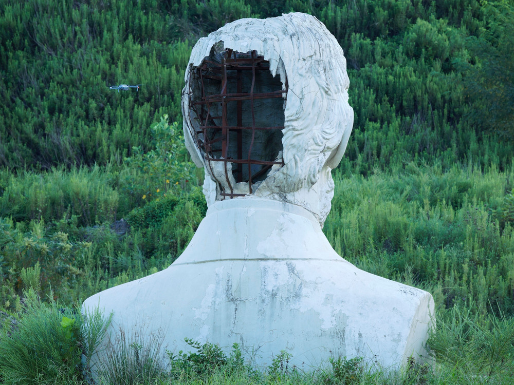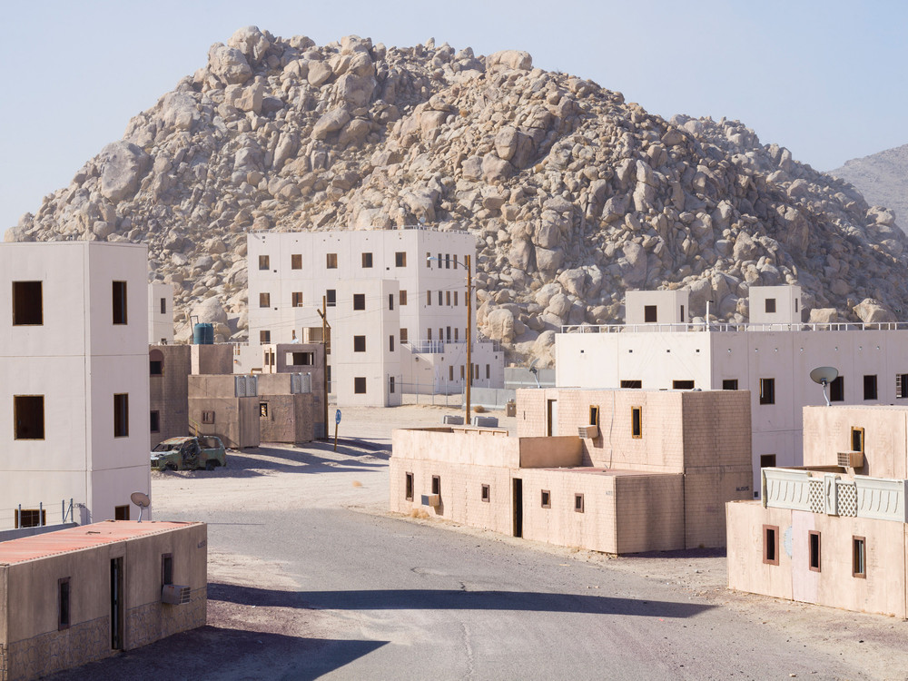 Mysterious interventions into the landscape amp up the sense of spectacle that runs through the book. A Mars simulation center sits within a landscape of pink and red rocks like a perfect stage set. A power plant looms over the green lawns of tract housing. Classically composed images of army training grounds and constructed desert cities appear. The fake trees that camouflage cellular network towers and the gaping hole in the back of a larger-than-life sculptural head of Abraham Lincoln accompanied by an almost oddly delicate drone, round out what Campany refers to as the duo’s “essay in visual form.”