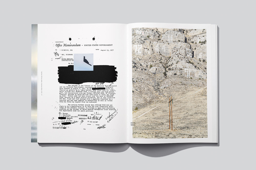 The duo play with this ambiguity with their sequencing. Angel-shaped cloud formations in various sunset colors hover above an overhead desert grid before spilling onto the next spread. Odd pairings or trios appear: white cars stacked up, runners dressed to match, figures in puffer coats who seem to multiply and diverge. Each of these images is marked with its file name—often a string of letters and numbers which, when immersed deep in the book, one might read as a secret code as much as a random computer-generated sequence. The book’s design delightfully toggles back and forth between the world of the desktop screen and the world seen through a photographer’s studied lens. Layering images atop each other and documents with black bar redactions, the artists create a sense of unfurling meaning and paths to more and more connections.