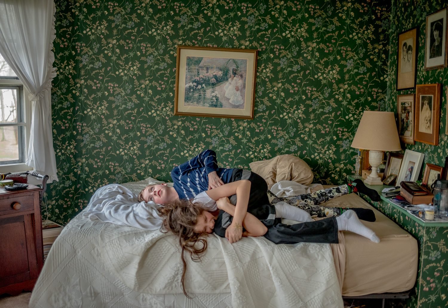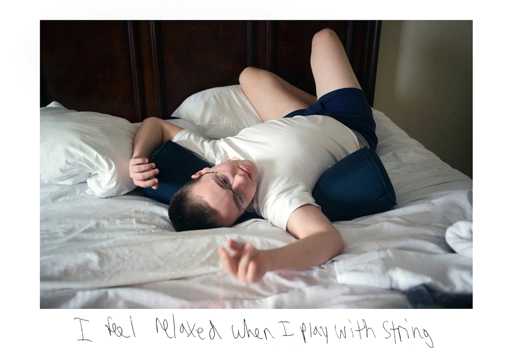 New York City-based photographer Erin Lefevre also works with the image-text format in her project Liam’s World, in which she documents her brother who has autism. When Lefevre first started her series in 2014, Liam was just 14 years old. “I had just finished my junior year of college and had begun to focus on documentary photography specifically, so when I was back home for the summer I decided to begin photographing my brother as a way to better understand him.” One of the images, depicting Liam stretched out on a bed, a red thread hanging from his hand, won the Wellcome Photography Prize last year. It’s a powerful depiction of one of his stimming—or self-stimulating—behaviours. Underneath it, he wrote, ‘I feel relaxed when I play with string.’