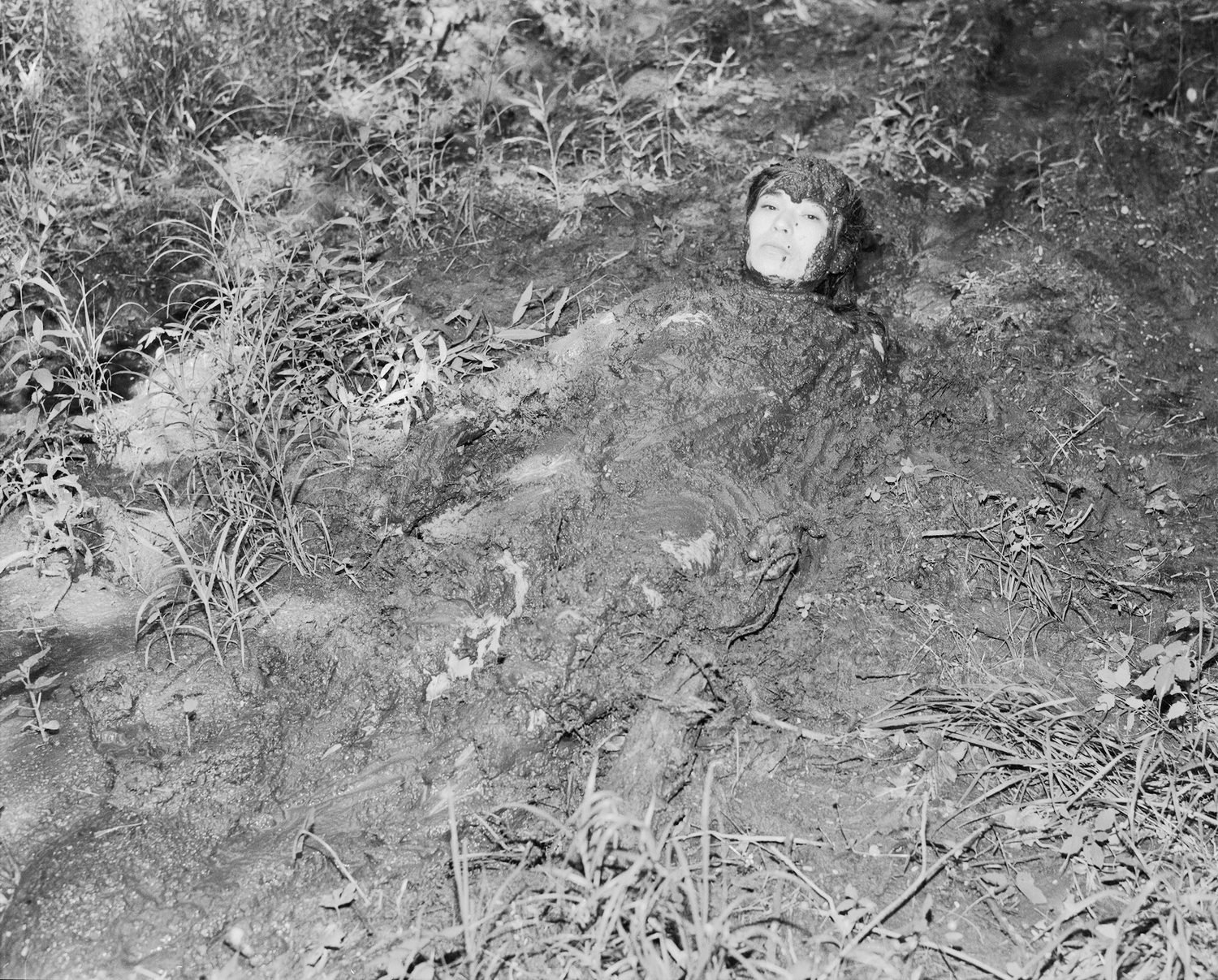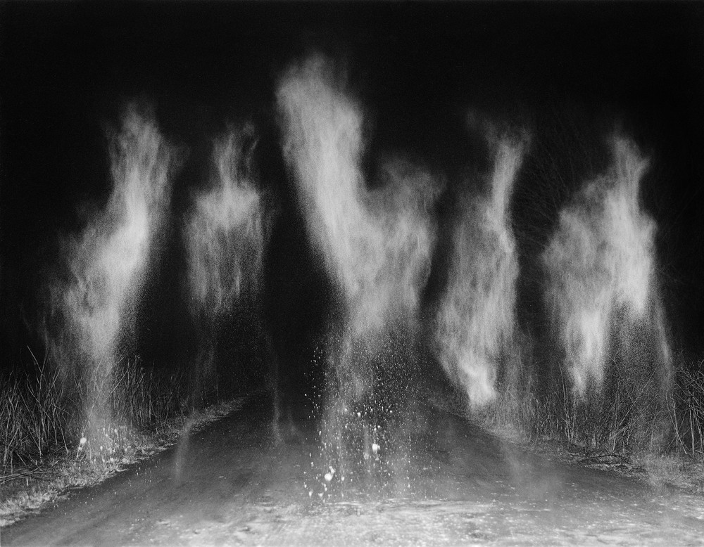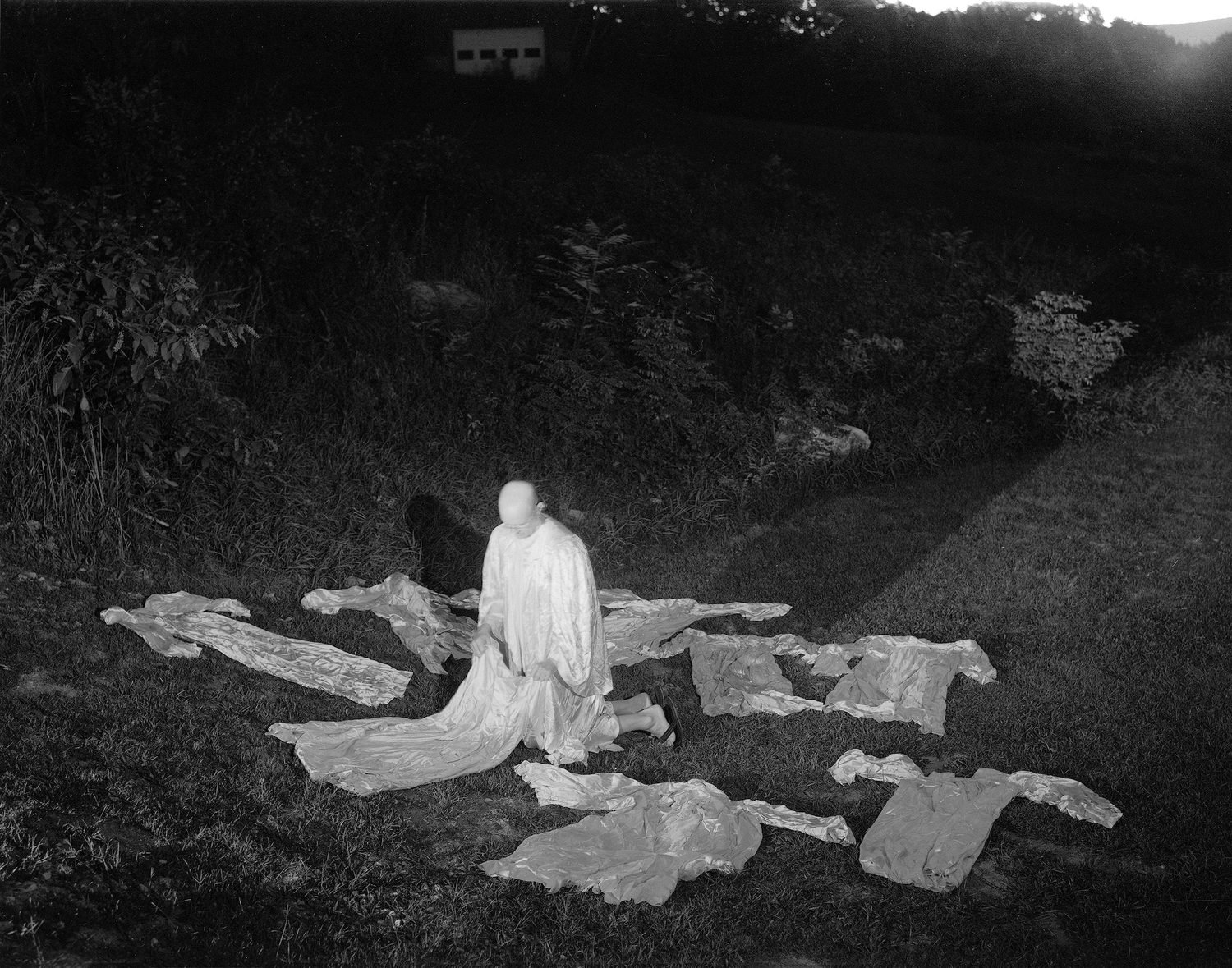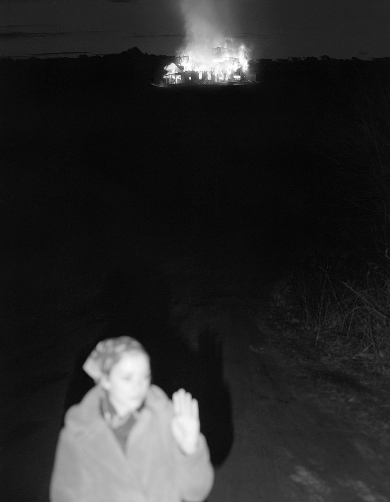 Within each image a whole story seems to unfold, each one building upon the eeriness of the last, enacted by a cast of unknown characters populating a vast landscape. A bearded man lies down, pointing skywards, in a delicate white nightgown; another man kneels before a group of dresses laid out on the grass, silvery and shimmering in the moonlight. Elsewhere, a woman lies buried alive in the earth, covered by dirt completely, save for a small hole for her face to peer out, and in another image, a blazing fire engulfs a house. It doesn’t feel real—it’s too dreamlike and woozy, as if the whole building is made of paper and hovering, alight in the midst of absolute darkness. That’s the thing about this work—it’s hard to tell what’s real and what’s not, which scenes were found and which ones were forged—and it’s this ambiguity that reveals the delicious precarity of the stories we tell. One of the most exciting questions to ask is ‘what if it were real?’ and this book has us asking it constantly.