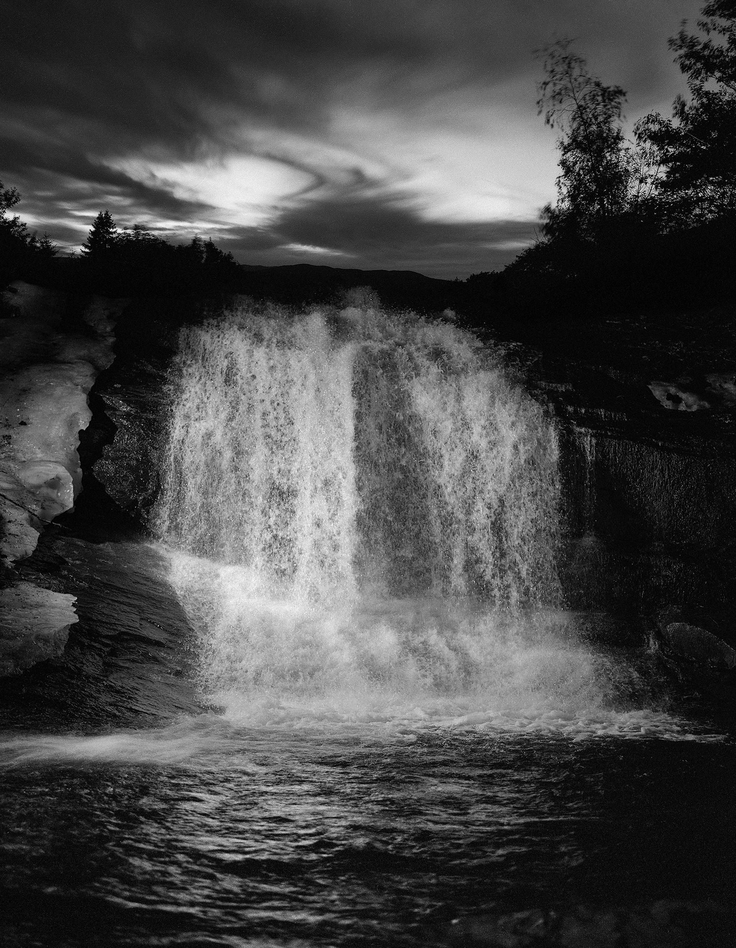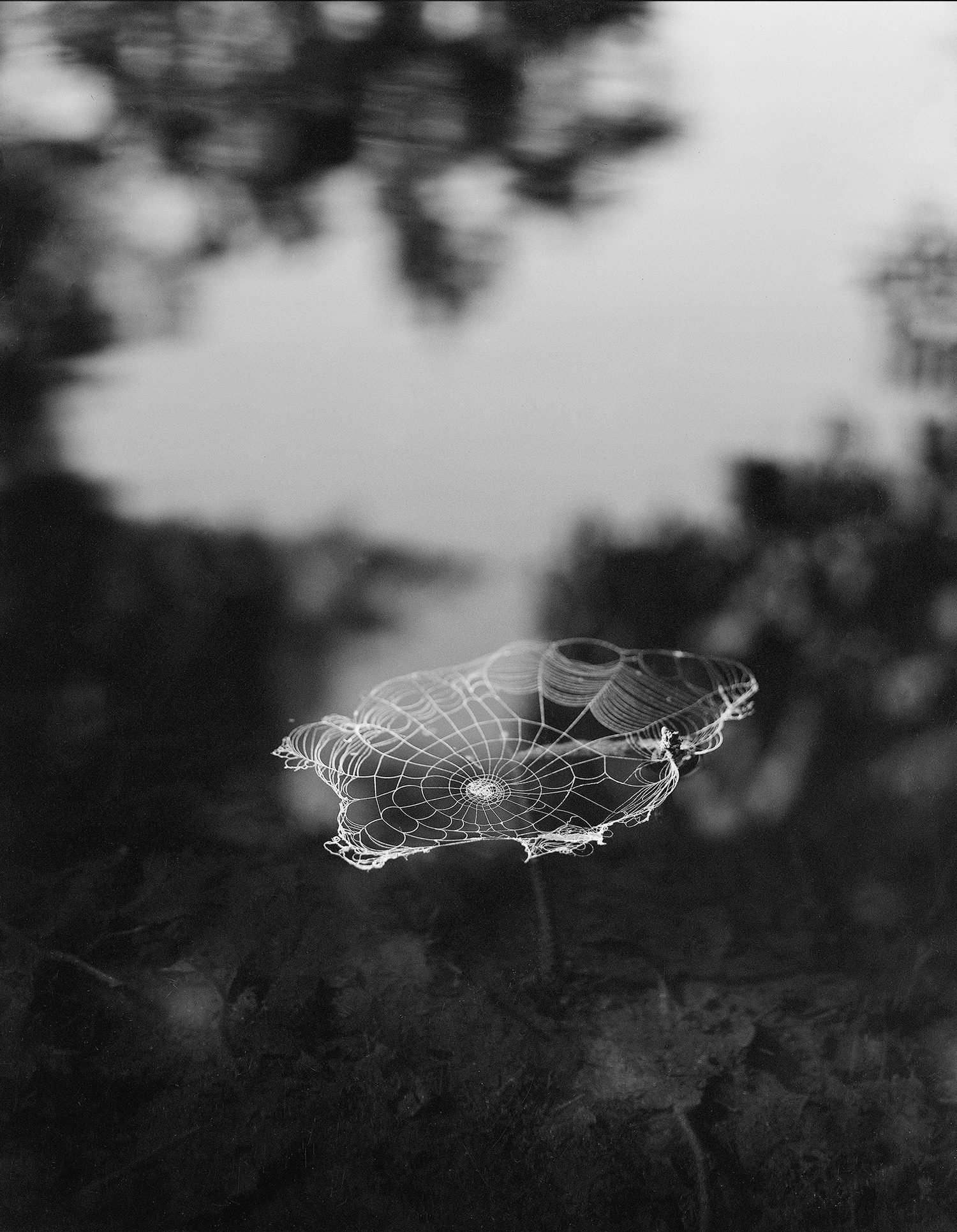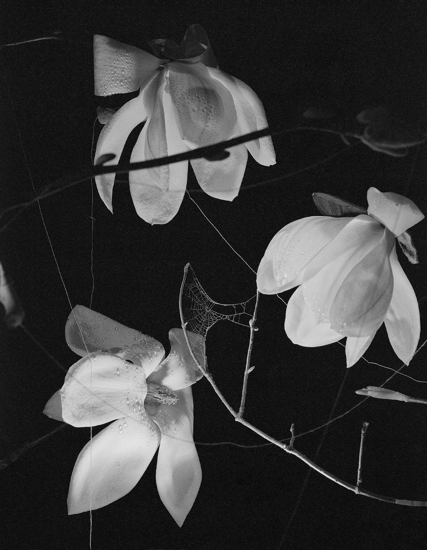In Paul Guilmoth’s new publication At Night Gardens Grow, the night becomes a stage for a strange, folkloric story, unfurling from the landscape the artist calls home. Concentrating on one field in particular, the book is a constellation of black and white images depicting ghostly figures and glowing foliage, spiderwebs and moths, baptisms and waterfalls glistening at night. It’s a careful, deliberate edit, one that builds in an intense and palpable way, transporting us to a dark fictional world that teeters on the brink between dream and reality. There are symbols we know from age-old fables here—rabbits feet and wooden cabins, nymph-like, bathing women and mirrors in forests—but they’re different somehow, transformed in the darkness, like fairytales gone awry.