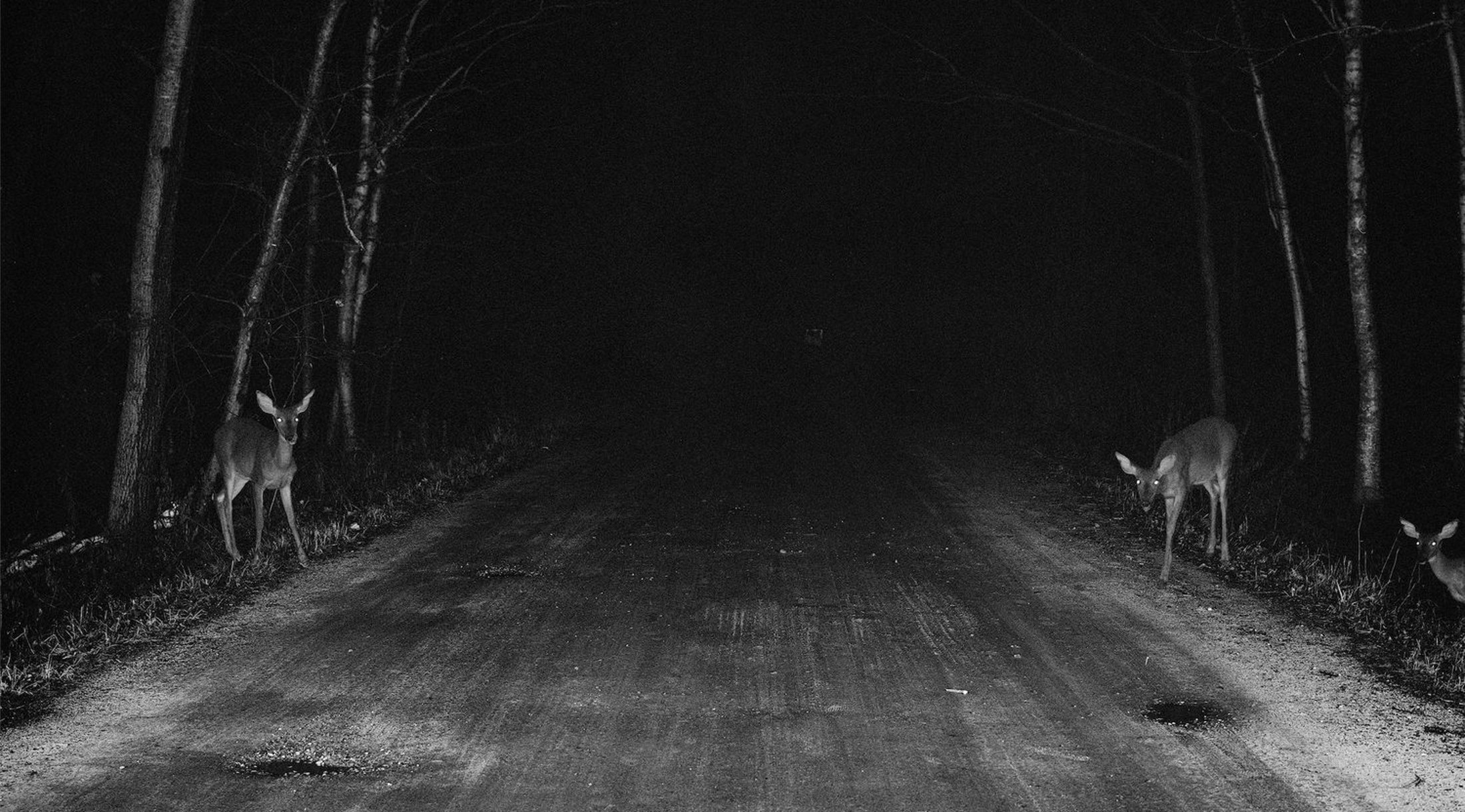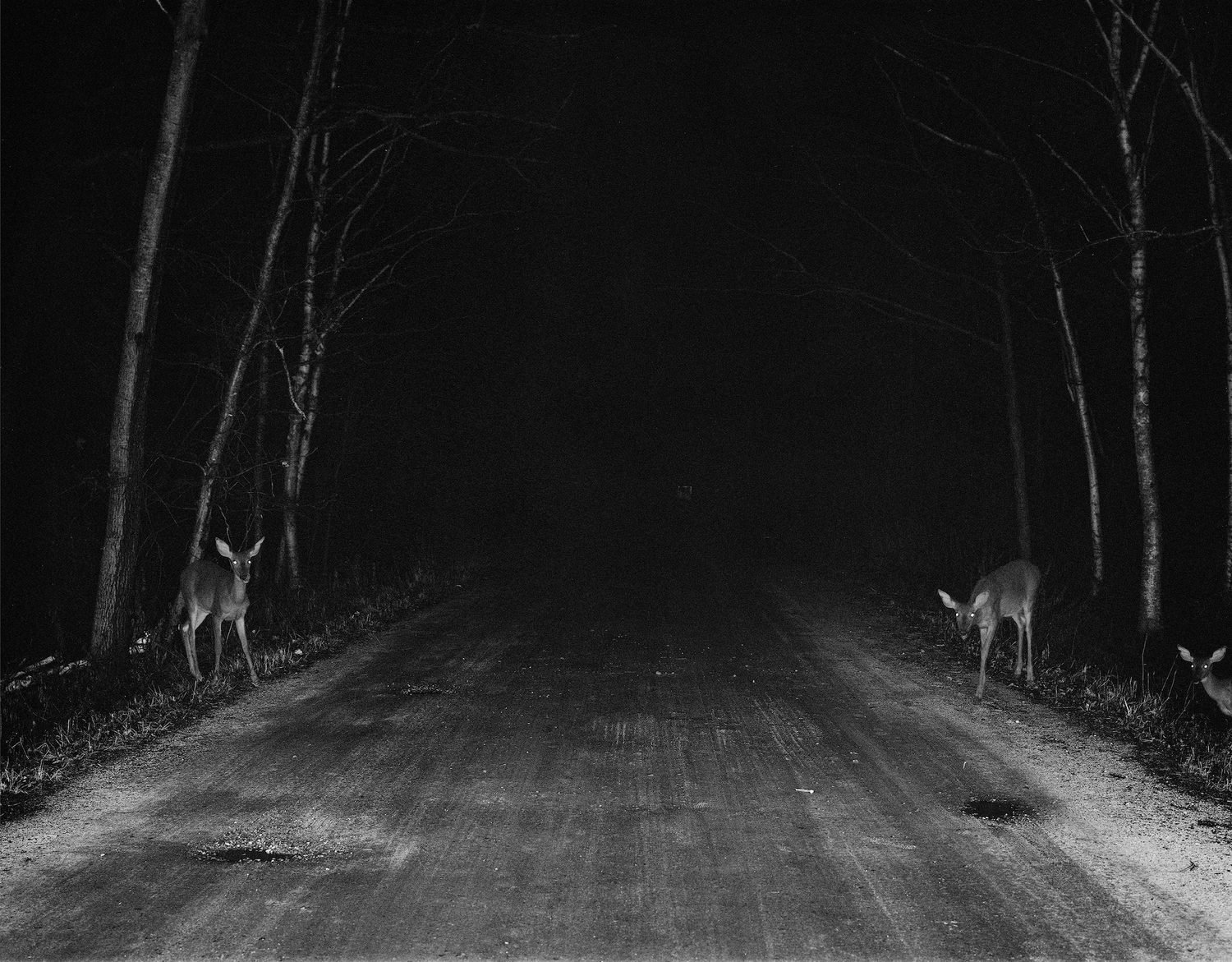 This nocturnal journey is somewhat directionless, conjuring a sense of place that feels just out of reach. There are a lot of images directly leading us into the darkness in this book. In one, two deer stand at the edge of a road, one on either side, beckoning us further into the nothingness beyond. Later, there’s a ladder inside of a cave, the very top of it at the mouth of a pitch black entrance. These are images to disappear into; gateways and portals that allow us to slip into this world.