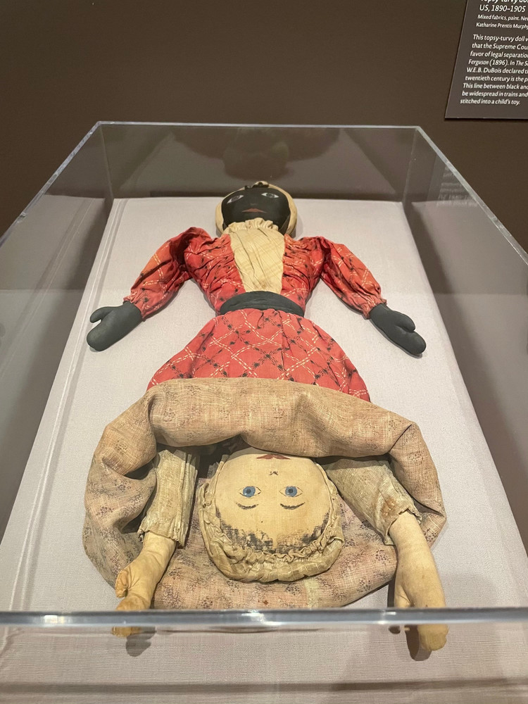 QM: “Topsy turvy” is the name for the design of this particular cloth doll invented and handmade by enslaved African-American women for their children and their white charges. The doll is double-ended, featuring a white girl doll and a Black girl doll joined at the hip. It’s designed so that the lining of one’s dress is the outside of the other’s, so that the skirt flips over to conceal one body when the other is upright.