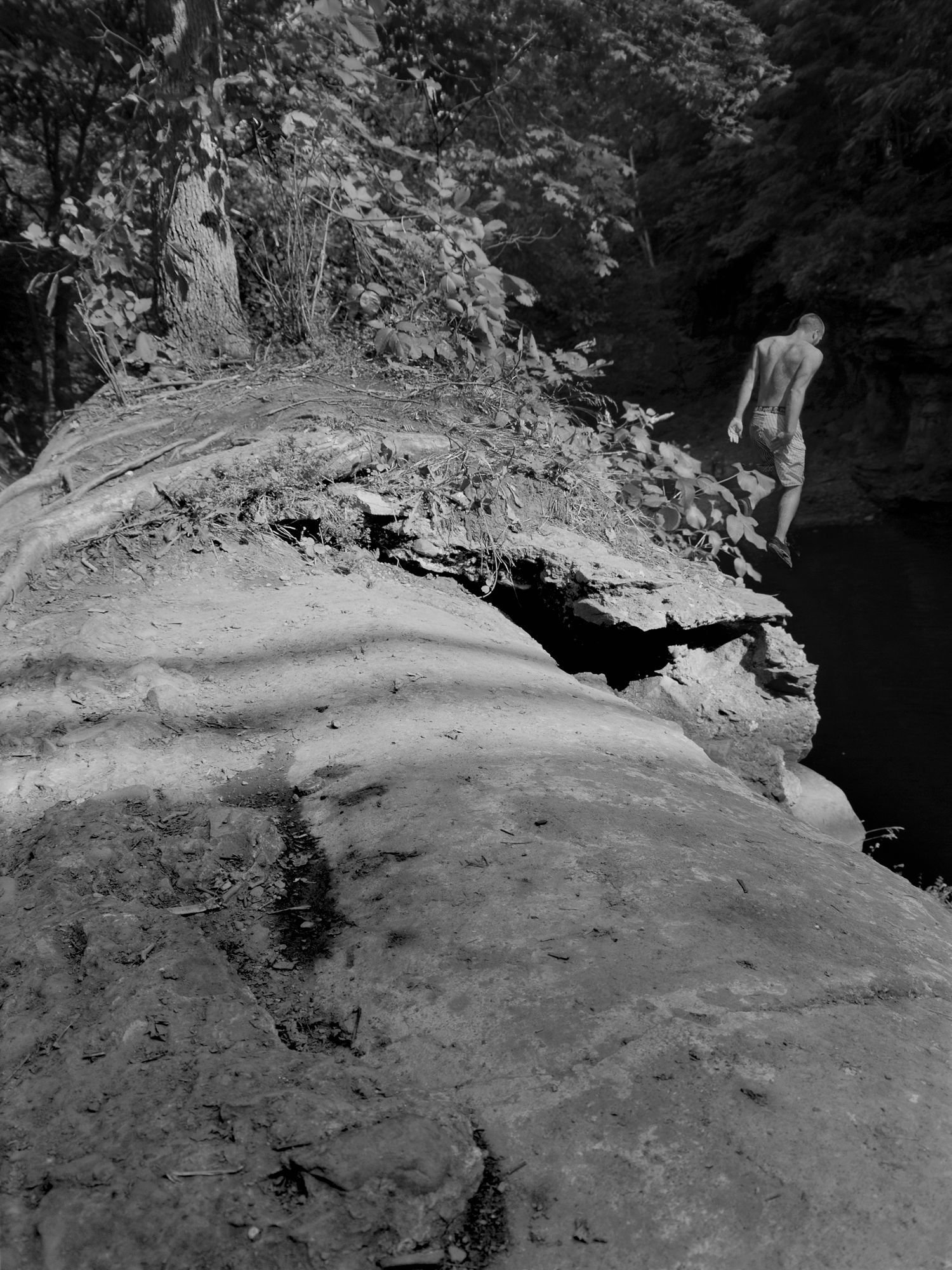 He arrived, and I was loading a camera. I was facing the side of a cliff—the kids run down this hill, make a leap, stand by the edge of the cliff and jump—and everybody had cleared out, but I see this person coming down the hill. He’s fully dressed so I thought, I’ll quickly load and he’ll be taking his clothes off and I’ll get some pictures. But I didn’t have time—he was in the water just like that. He doesn’t dive, he doesn’t jump. He just throws his body. I’m just thinking, “There’s no way he got his clothes off, there’s no way he landed.”