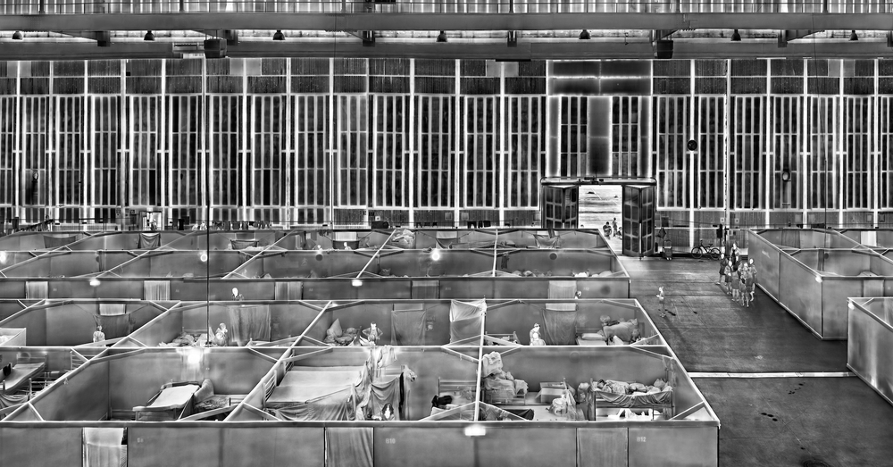 The extent of the crisis that Mosse documents can be gleaned from the range of countries covered in his project: not just the Balkans and eastern Mediterranean but also Italy, Germany, Lebanon and France. There is a panoptic shot at Berlin’s Tempelhof airport as a temporary shelter in 2016, eight years after its closure. The viewer peers down to see inside the terminal building, as if into a doll’s house with the roof taken off, to observe the refugees’ domestic quarters. The feeling of intrusiveness that comes from looking at their bunk beds and bags of meagre belongings registers the fact that people are living here in a state of semi-permanence, transit passengers in the extreme.