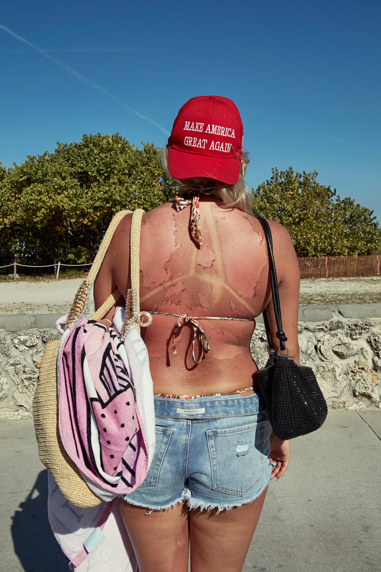 Bright blues, neon greens, and pinks play across the sand. Beachgoers in repose and mid-acrobatics fill the frame. “I was struck by how everything seemed to coexist on that strip of sand—beauty, craving, leisure, performance, and, at times, a sense of collapse—all exposed under the same bright light,” he notes. The beach is teeming with children and adults at play. There are Hello Kitty bedazzled acrylic nails, the fizzing delight of children tumbling to shore in a wave, and the painful-looking, peeling back of a sunburnt Trump supporter. Koraicho has a sharp eye for detail: the triangular forms of a watermelon wedge replicated in the popsicle print of a Speedo, the gulls catching a break in the shade of umbrellas.